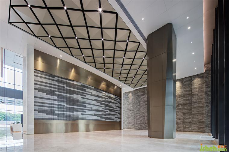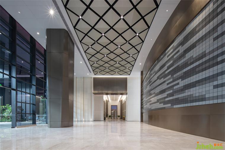 首層會堂門廳選擇了簡潔的手法和明亮的色調(diào),同時采用了自然紋理的石材,貫穿全局的線條以一種充滿建筑體量感的形式出現(xiàn),線條的細節(jié)形成了原始的設計構思,基地總部設計另外融入了以企業(yè)文化為精神的書法富含禪意的東方元素,使有形的建筑空間傳遞無形的企業(yè)價值觀,塑造企業(yè)文化與工作場所之間的共振磁場。