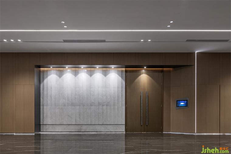 二層走廊空間遵循理性有序的設計法則。運用了意大利白金沙石材和深色木紋飾面板貫穿于空間秩序和關系。從而讓整個空間有了延長性,工整有序