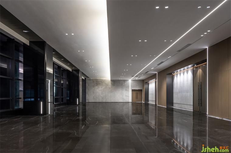 不同的幾何形狀維度的分割,室外引入的光使空間更具視覺沖擊力,影使線條更加立體與多變,光與影的結合,基地總部設計讓整個構造充滿張力與律動。豐富的視覺體驗梳理出辦公區(qū)域的電梯廳的功能動線。一段關于科技制造的觀游體驗之旅,由此展開。