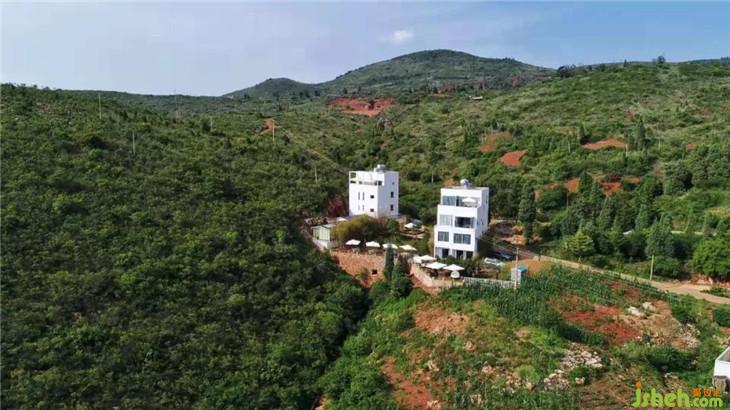 青草蔥翠之間兩棟白色的房子,