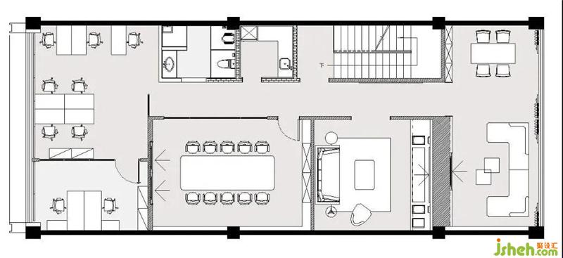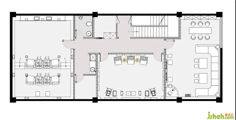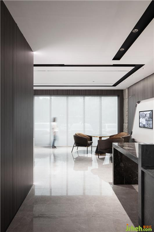 首先最重要的開始,應該是LOGO背景墻。兩邊暗藏燈帶,從地面一直延伸至天花,起到延伸感。從前臺一步步牽引,開闊明亮,裝修設計摒棄主燈帶來的壓抑,在沒有主燈的空間里,信息流動通透自然。黑色燈槽平行交錯,科技時尚感逐步放射出來。