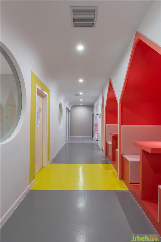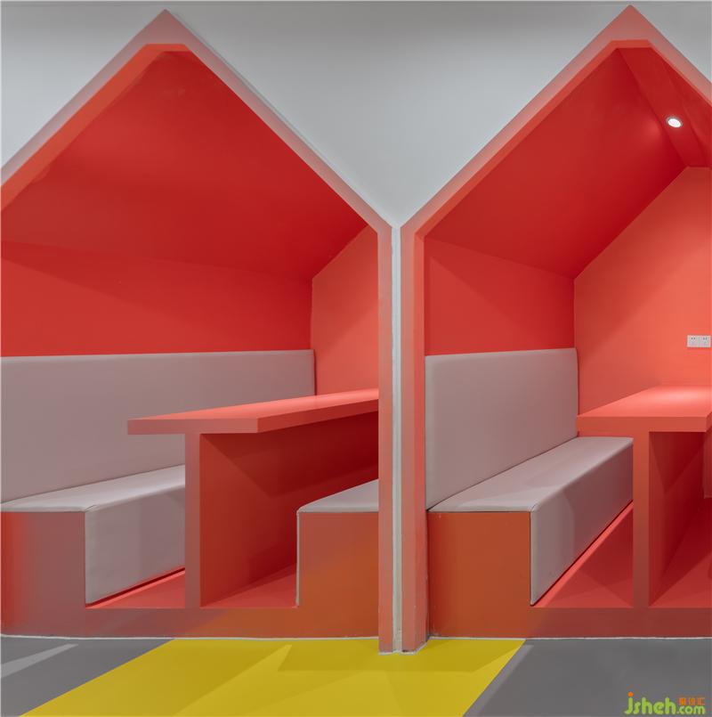 廊道兩旁在橘色和黃色包裹下的讀書屋,孩子閑暇時(shí)間可以在這里學(xué)習(xí)玩耍。彩色學(xué)習(xí)小屋每一個(gè)座椅的邊角全部用皮質(zhì)包裹,安全舒適缺一不可。