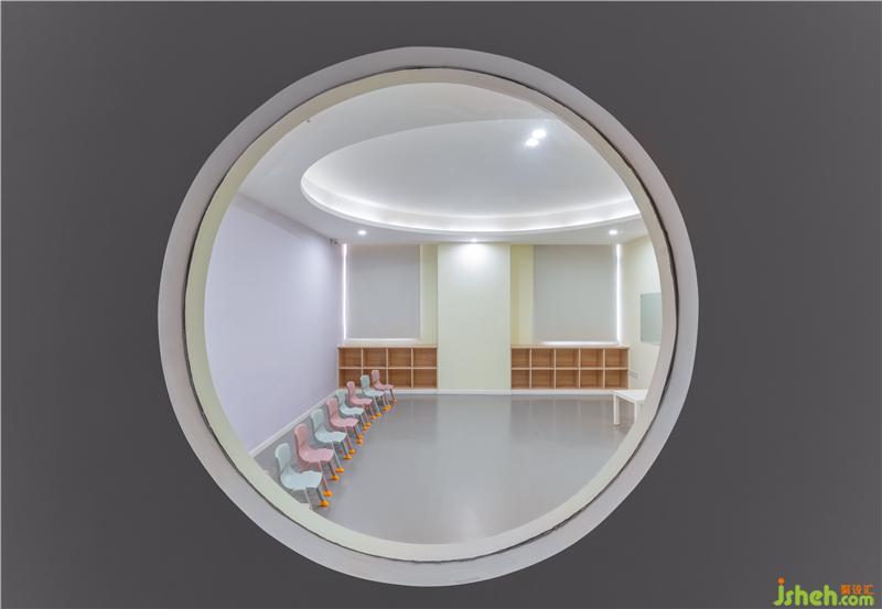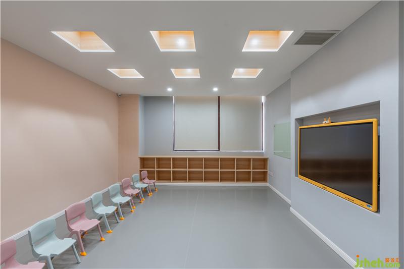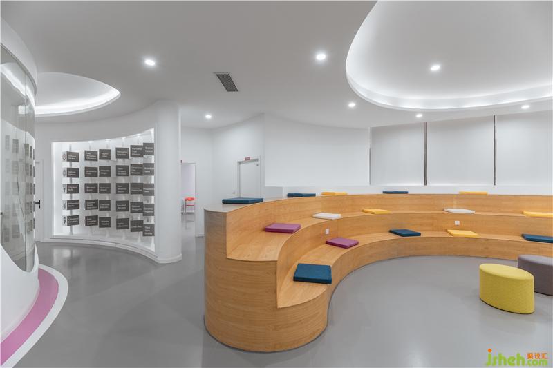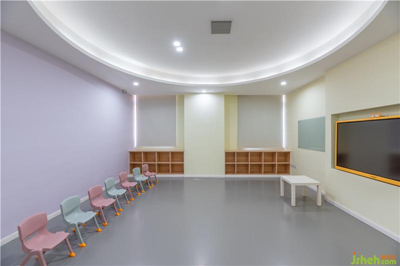 一體式原木色座椅,裝修設(shè)計(jì)點(diǎn)綴各種花色的坐墊,整個(gè)空間就像是流淌的河水,孩子們置身其中,就像自由的小魚兒。房間裝修設(shè)計(jì)中的弧線與座椅的弧線形成完美的呼應(yīng),空間感更大。中間大塊的空地可用作互動(dòng)交流,增加游戲、活動(dòng)、思維拓展等情景式教學(xué)。