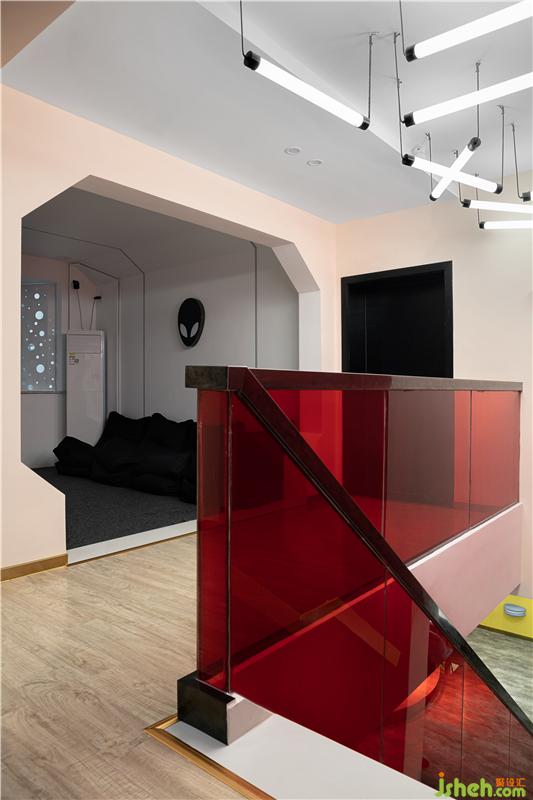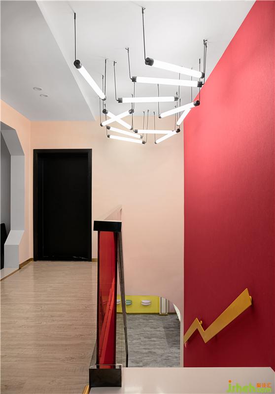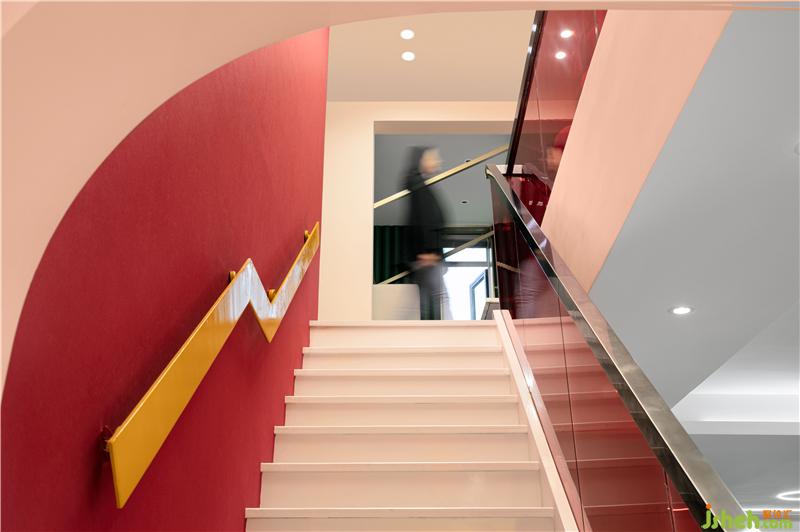轉(zhuǎn)角的樓梯間的裝修設(shè)計(jì),是整個(gè)空間色彩最鮮艷的區(qū)域。強(qiáng)烈對(duì)比的紅黃色塊,跳躍的顏色和簡(jiǎn)約的線條勾勒出空間靈動(dòng)時(shí)尚的氛圍。