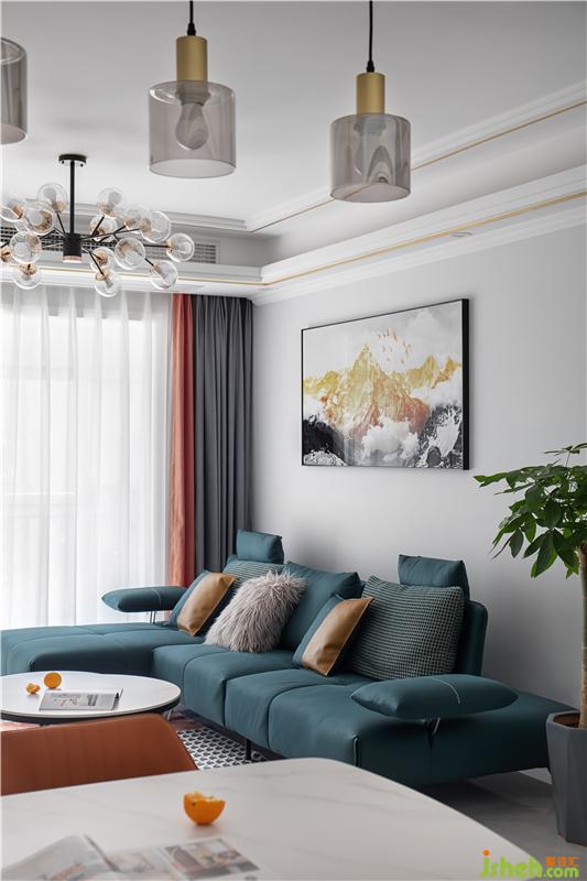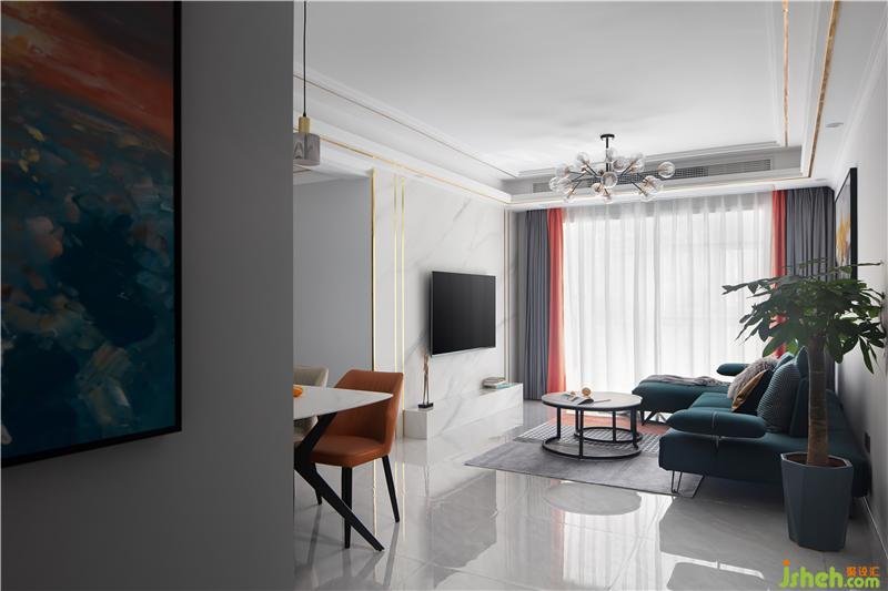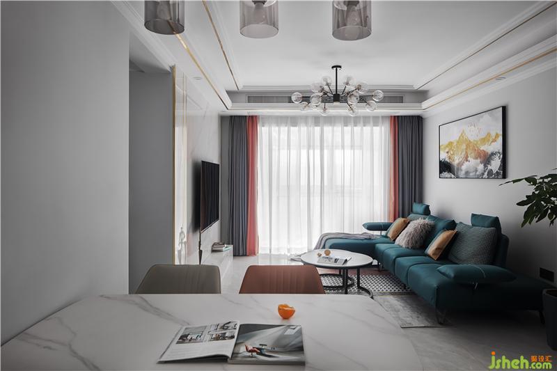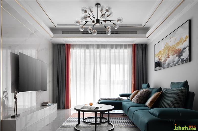 客廳以輕奢質(zhì)感的金屬色裝飾小燈點(diǎn)綴,營(yíng)造出精致的極簡(jiǎn)韻味。輕松休閑的藍(lán)色沙發(fā),一字型長(zhǎng)落地電視柜、黑白相間的茶幾,獨(dú)具風(fēng)味地毯搭配精致的裝飾品,整個(gè)客廳散發(fā)著簡(jiǎn)約的高級(jí)感。