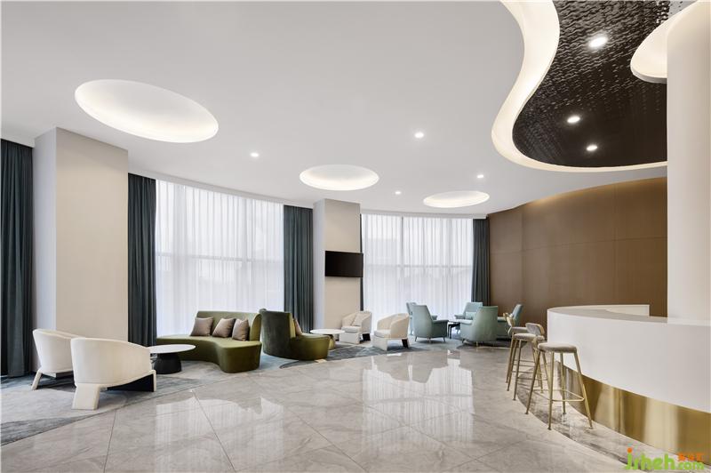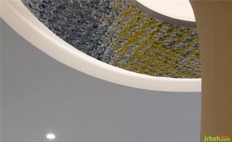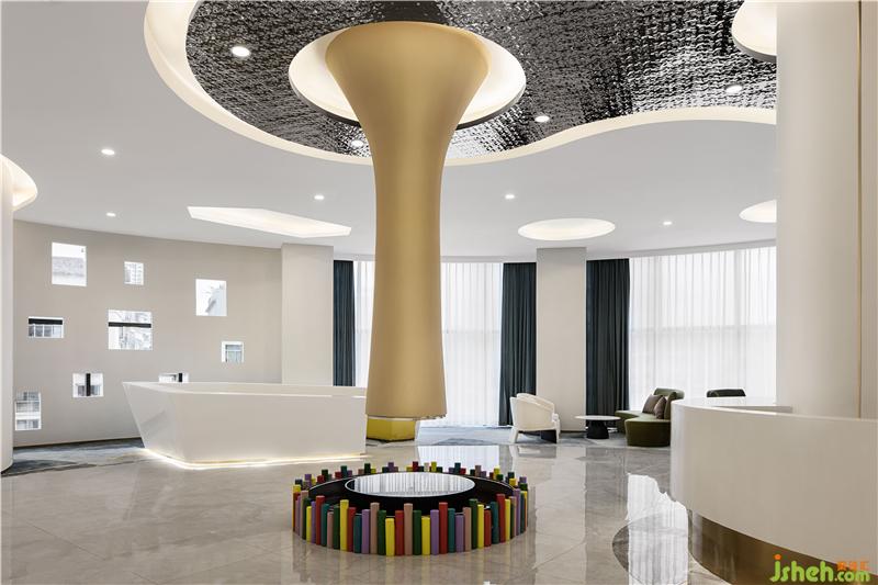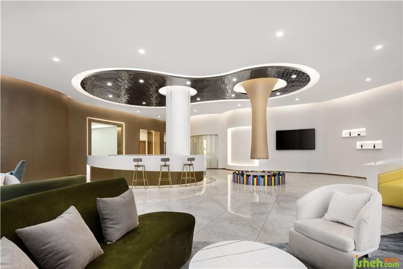 大廳大量采用幾何圖形及弧形元素,簡約而又不失時尚感。以白色為主色調,結合不同的區(qū)域少量點綴金色、橘色、黃色、果綠色元素,讓整體空間氛圍透露著輕奢與溫馨感,滿滿的高級感。