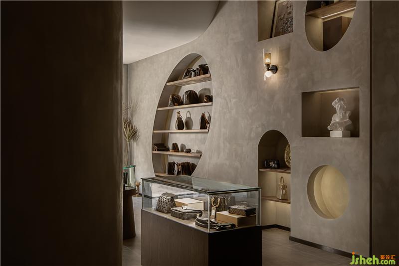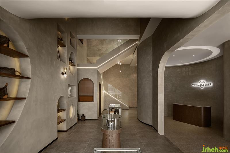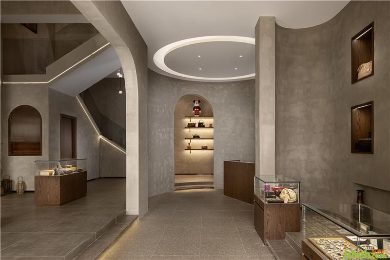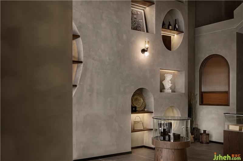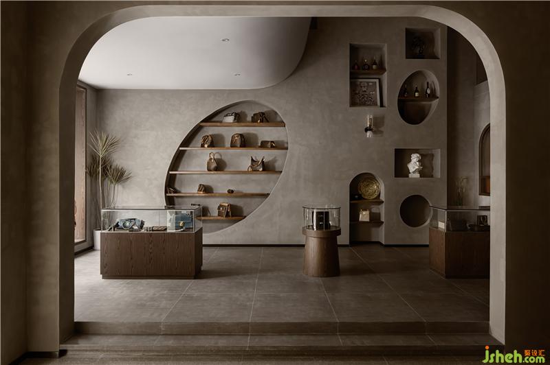 墻面涂刷低飽和高級(jí)灰調(diào)質(zhì)感漆,以柔和、層次自然的紋理,很好的收斂了室外的浮光動(dòng)態(tài),店鋪設(shè)計(jì)讓人即刻開啟一段沉浸式尋寶體驗(yàn)。而弧型隔斷、拱門的巧思可謂一舉多得,從功能上弱化了原始柱梁的突兀;也營(yíng)造了視覺沖擊力的豐滿;同時(shí)造就了懷舊的工業(yè)氣息。當(dāng)人穿行其間,仿若穿行于時(shí)間軸的軌跡,以至于舒適的體感鏈接到更強(qiáng)的購(gòu)物欲。