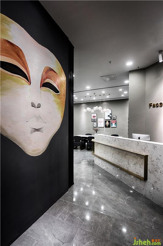 簡潔線條造型隔斷利落干脆,像極了重慶人率真的個性。兩邊留出主要的動線通道,保持通透、亮堂且呼吸感順暢。入口處超大的摩登臉譜手繪圖案,漸變矍鑠金、澳洲甜蜜橘氤氳臉龐,啞光暗黑系質(zhì)感漆打底加深主題印象。迸發(fā)出深邃與神秘的氣息,讓發(fā)廊藝術(shù)博覽場景瞬間點亮,蛻變之旅從目及之處開啟。