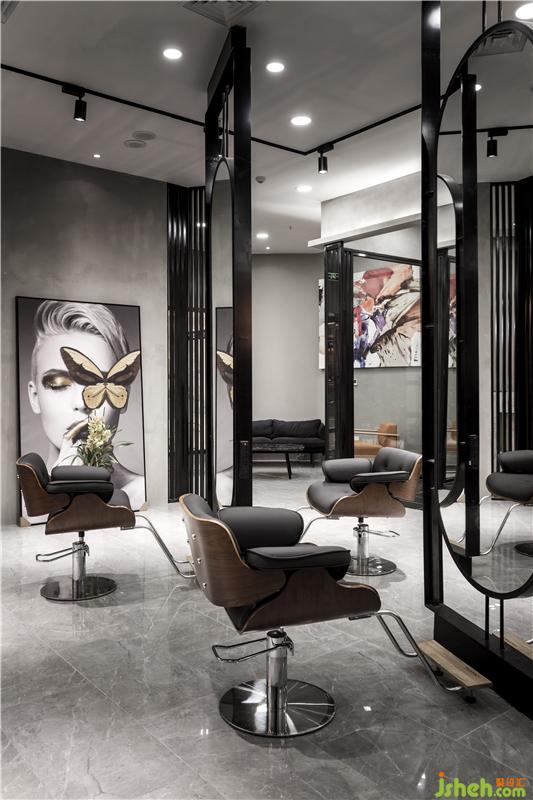 然而,《愛麗絲夢游仙境》的場景在此得到相似的體驗,陣列靈活的幾何落地鏡像一張張神韻的魔法撲克。從兔子洞穿越到鏡中,將每一個人的裝扮期望值都被拉入這里。鏡框造型由頂天立地公車頂縱梁演變而來,沿襲酷黑族磨砂金屬框觸感細(xì)膩,可由發(fā)型師360°按需旋轉(zhuǎn)無壓力,這與柚木皮質(zhì)的沙發(fā)軟硬適度的結(jié)合,配合客人一同演繹這出好戲。