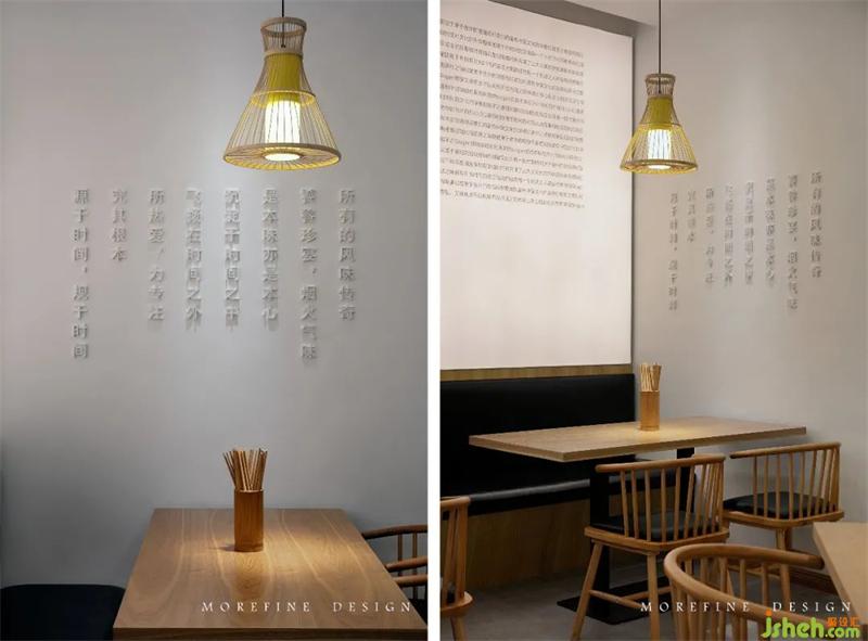 空間餐廳設(shè)計(jì)以瓷白色調(diào)為主,墻面背景飾畫以中文方塊字陣列組合為線條,形似“雁”型展翅,寓意春去東來祥兆如故,由北向南,而獨(dú)愛這一味。
