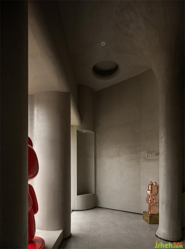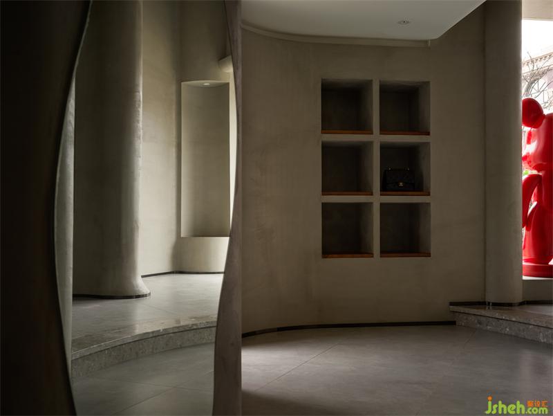 隔離了市儈的招搖,驛動的心被帶入室內。店鋪設計建筑梁結構與不同樓板之間的關系,與幾何構造相互滲透,讓復雜性聚合成一個整體。避免了機械的乖張,故意營造出讓人詫異的破壞性影劇場景,特意手工打造的好幾種斑駁藝術圖案的漆面,在四季白晝的光線中漸隱漸顯,與厚重的幾何體塊幻化交織,迭代出飄渺的神秘效應。