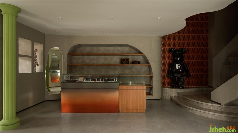 伴隨著橙綠撞色的飾面聚焦,方寸之內幾乎都被精致的Vintage單品和極具雕塑感的陳列體塊點亮,將核心展示區(qū)推向關注的高潮。