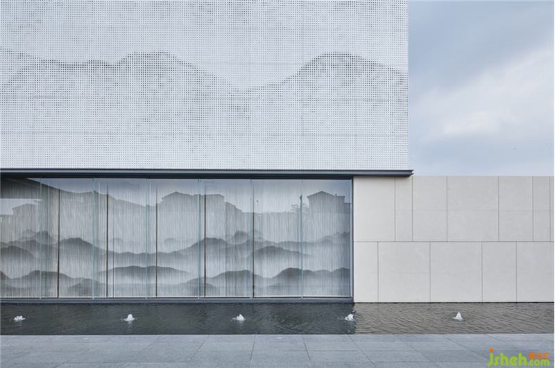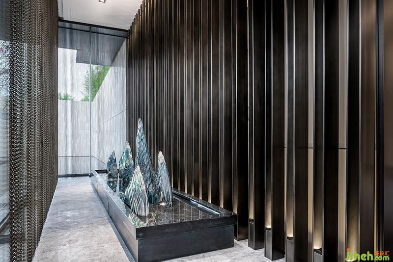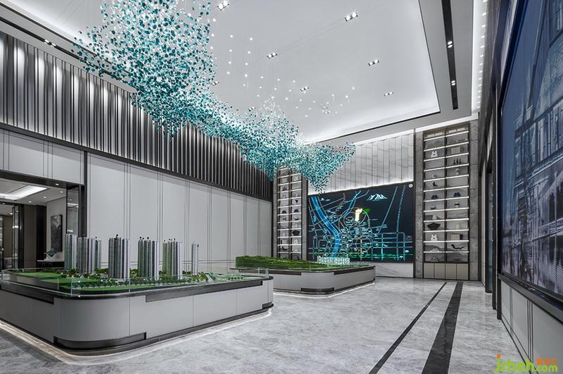 垂墜吊燈裝置,緩解立面關(guān)系的單調(diào),突出中心沙盤區(qū)的視覺聚焦點。溫婉的線條輕盈流動,熠熠生輝,使東方意境在無形之中鋪灑開來。