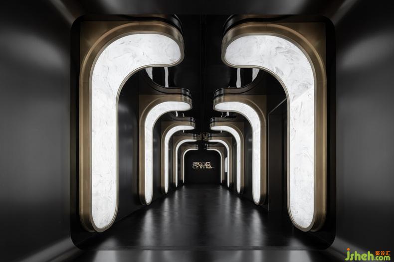 界面裝飾具有舞臺布景般的平衡構(gòu)圖,序列對稱的曲面燈光裝置組合,提煉源自新天地石庫門的深而長的弄堂形態(tài),線性的節(jié)奏韻律指引行進體驗向內(nèi)延伸。