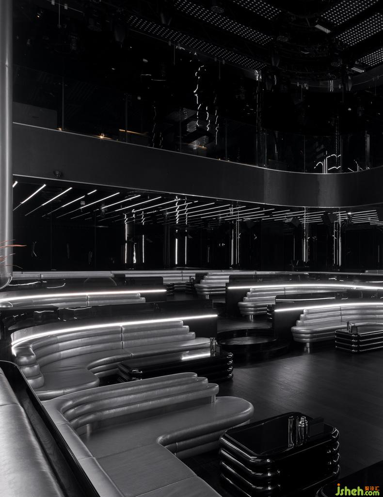 石材、鏡面、烤漆、不銹鋼、皮質(zhì)等材料組合為鮮明的視覺傳達,主色中卻有有著近百種不同層次的“黑”。夜店設(shè)計形態(tài)簡潔而抽象的有機曲線,亦打破橫平豎直的構(gòu)圖并重新釋義經(jīng)典美學。