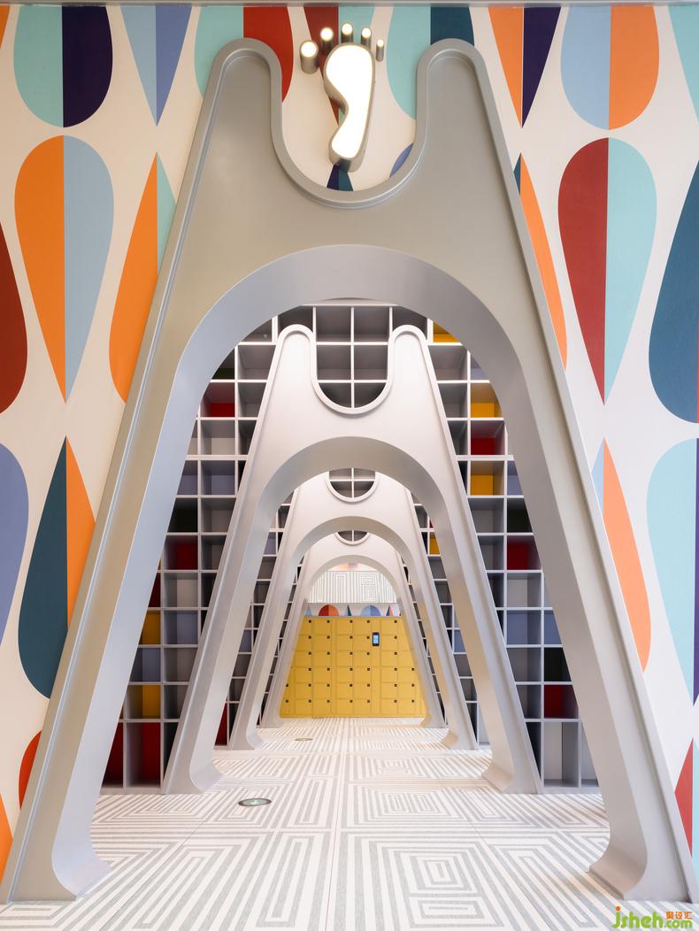 閩南語中“奧蘇阿|aosua”的意思是后山,童年記憶里的那座無名之地,隨著時(shí)間,逐漸在消失和被淡忘……層疊視錯(cuò)的入口仿佛時(shí)空洞窟,夾雜著光影下的反差,重啟一場想象力的漫游。室內(nèi)設(shè)計(jì)師“山”的輪廓賦形于換鞋區(qū)大小尺度的空間界面和家具模塊,兒童樂園設(shè)計(jì)以抽象的色彩及圖案拼接自然記憶,倒掛其間的絨草裝置更添注超現(xiàn)實(shí)的意趣。