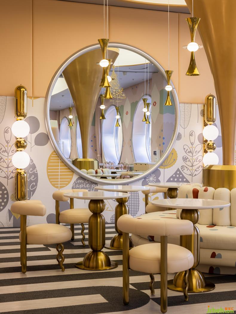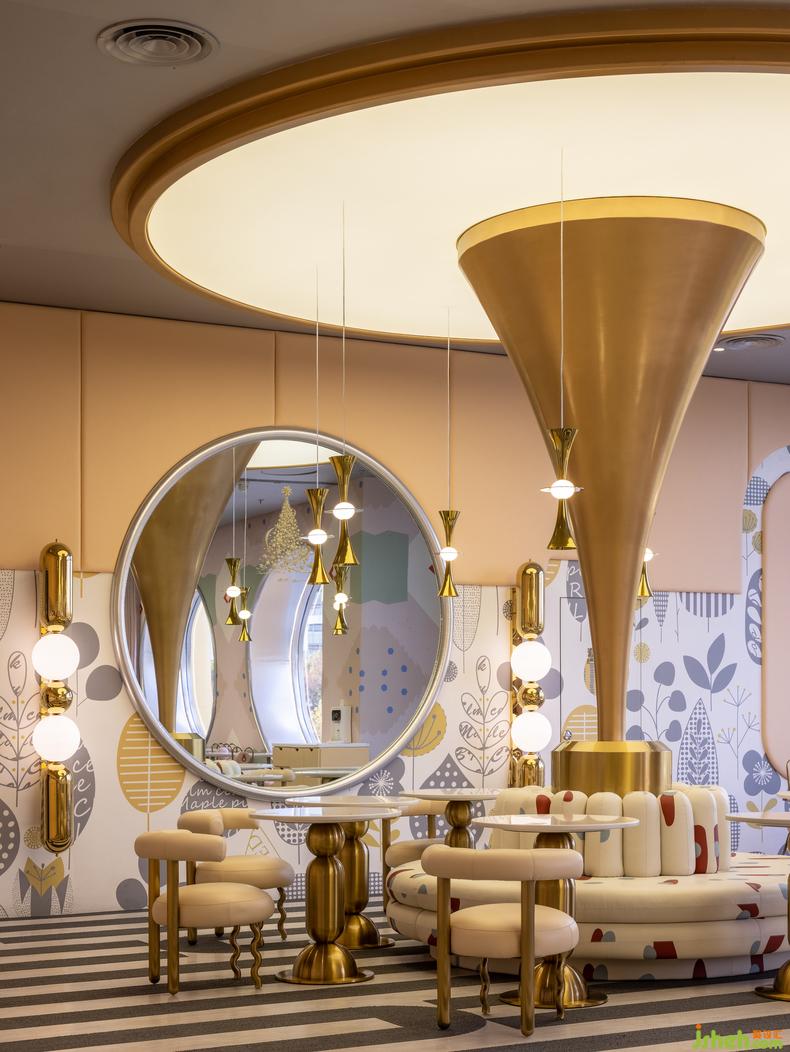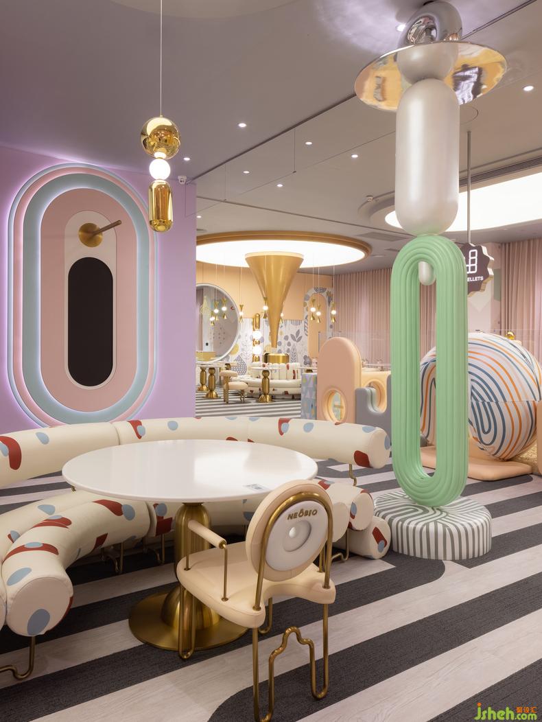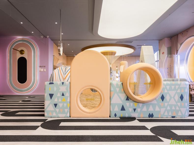 主體空間呈現(xiàn)雙層結(jié)構(gòu),室內(nèi)設(shè)計(jì)師容納豐富的縱深場(chǎng)景和內(nèi)部陳設(shè)密度,“后山”則是貫穿始終的母題。彩虹、太陽(yáng)、云朵、月亮,圍繞中軸的山神柱展開(kāi)布景,將斑斕熾烈的簡(jiǎn)筆涂鴉化作具象輪廓的真實(shí)體驗(yàn),喚醒記憶神經(jīng)中的空間好感。大自然的調(diào)色盤賦予空間全尺度光譜,眾多視覺(jué)要素統(tǒng)一為生動(dòng)的全景。尤似馬蒂斯的理想,“用色彩在畫(huà)面上奏出音樂(lè)”。