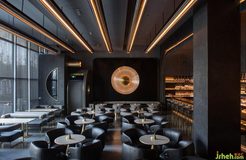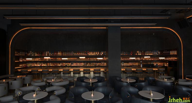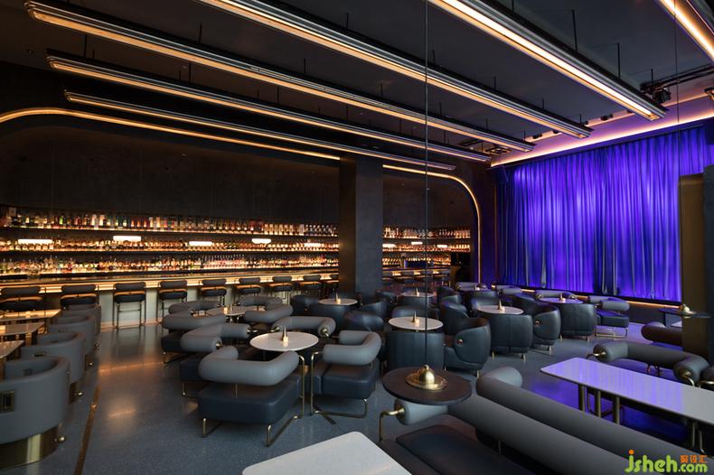 酒吧設計按鈕移開電動門進入酒吧主體,臥于吊頂上的金屬軌道燈,引導視線.一幕深邃的藍色幕布如果凍般凝固在舞臺上.