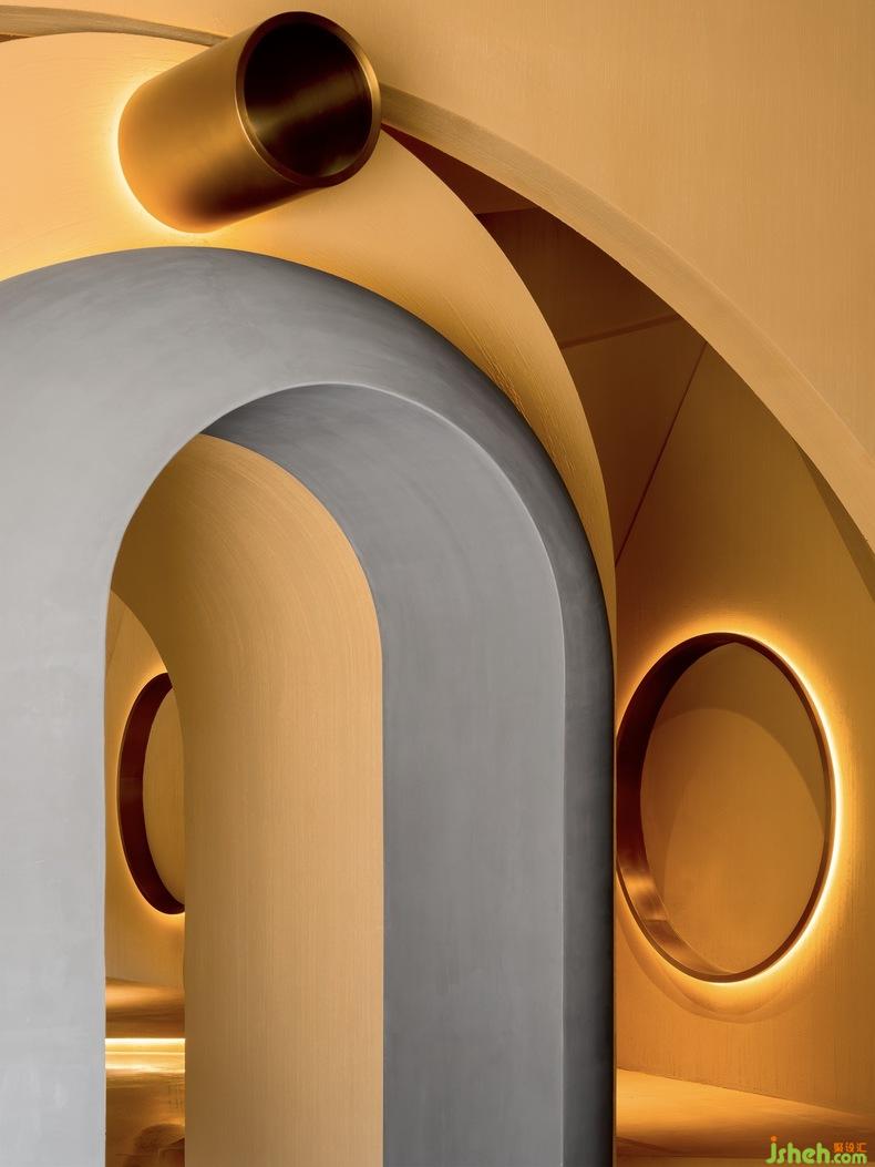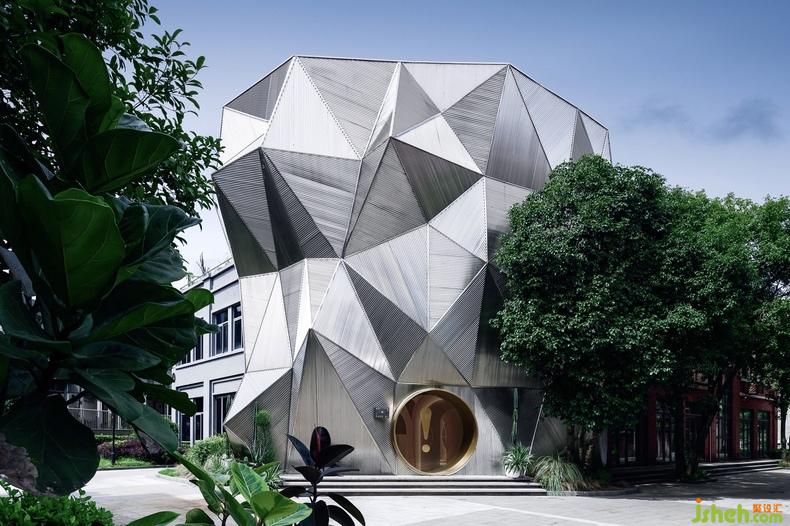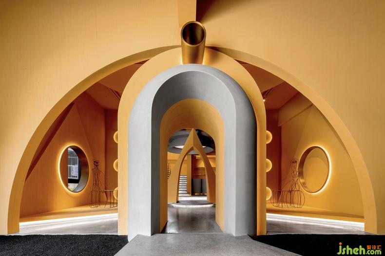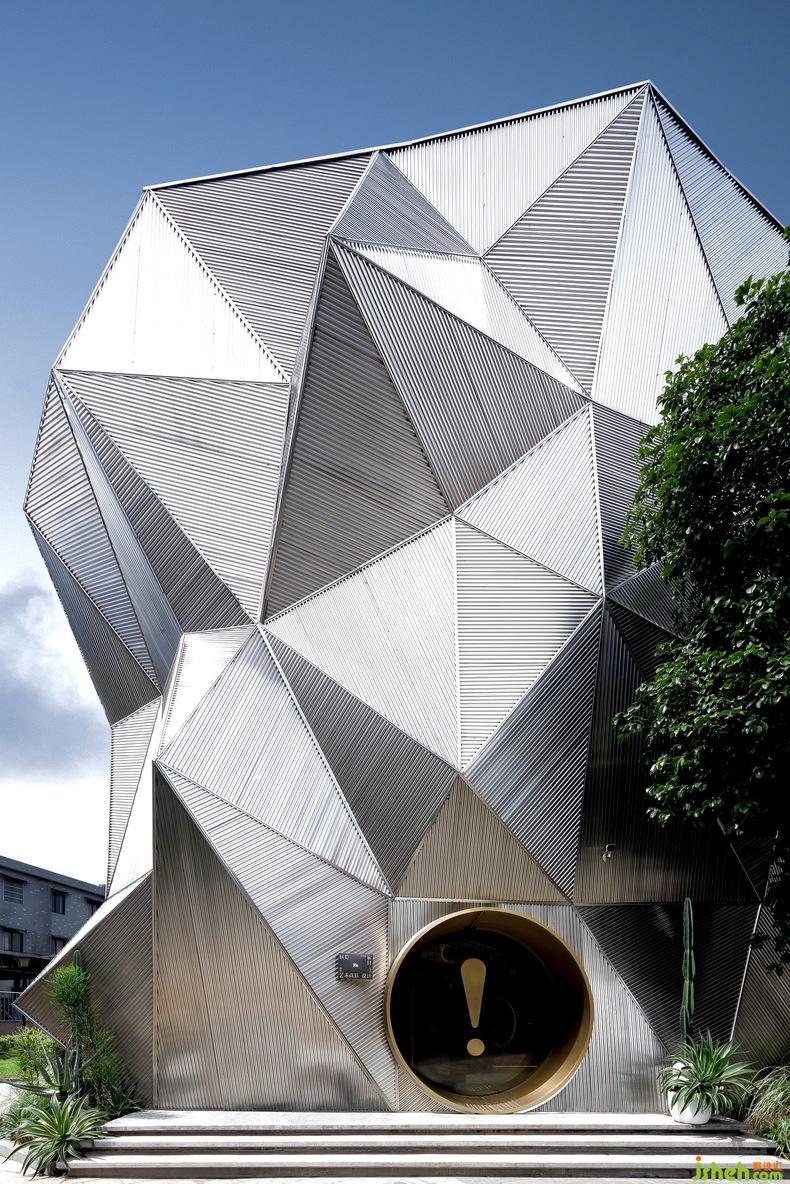 以瓦楞堆疊的懸崖作為外立面造型設(shè)計的概念,奇異的視覺體驗涉及到復(fù)雜的工藝結(jié)構(gòu)——不銹鋼瓦楞板的收邊與銜接,在建造過程中設(shè)計師不斷思考和改進(jìn)工藝節(jié)點與材料的處理,最終完成整體效果。懸崖洞口修飾巨大的驚嘆號,牽引人們探索未知的世界。而一切先知的視覺畫面都成為怪誕異形空間的索引。