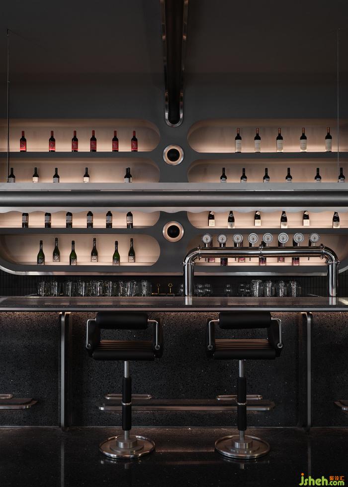 空間中的石材、金屬、皮質(zhì)、海綿、音樂、幕布,經(jīng)由設(shè)計在不改變物質(zhì)形態(tài)的基礎(chǔ)上,餐廳設(shè)計重新組合其線、面、體積、重量、紋理,而形成被鉆石般精密計算、切割打磨、晶瑩無暇的一個整體場景。幾何與有機構(gòu)圖交相疊映,不同光澤度中和色系上的沉悶,恰到好處地劃落視覺重點。