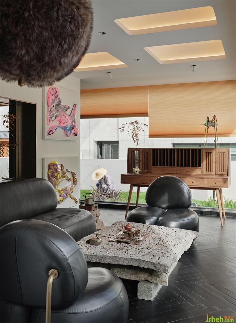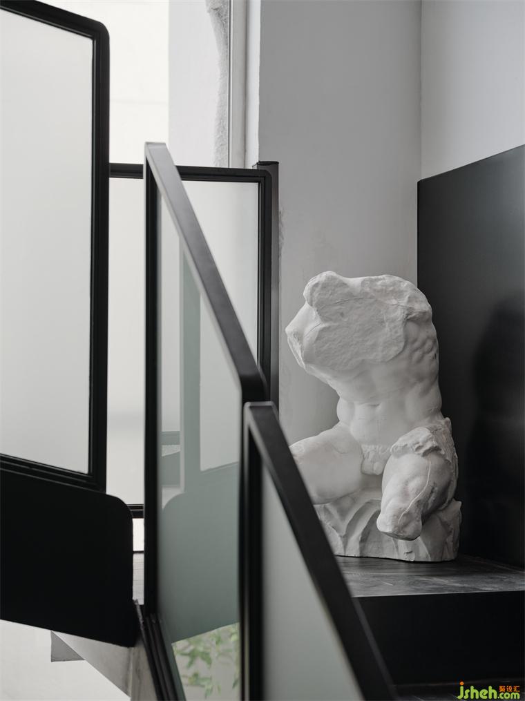 室內(nèi)的原結(jié)構(gòu)老化,隔間多、通道復雜,導致整體坪效的浪費。但不同于常規(guī)解決方案的“開放式”拆改,設計基于對零亂體塊的梳理歸納,將重心轉(zhuǎn)移到畫廊式的展陳視角,辦公室設計通過“賞畫”壓縮空間建筑的深度,辦公室設計消解隔墻的體量感,賦予條件不盡理想的空間基礎以新的闡釋。