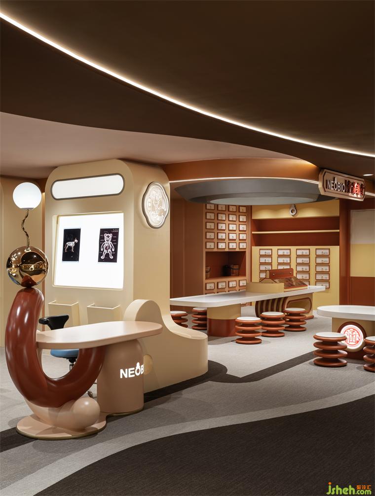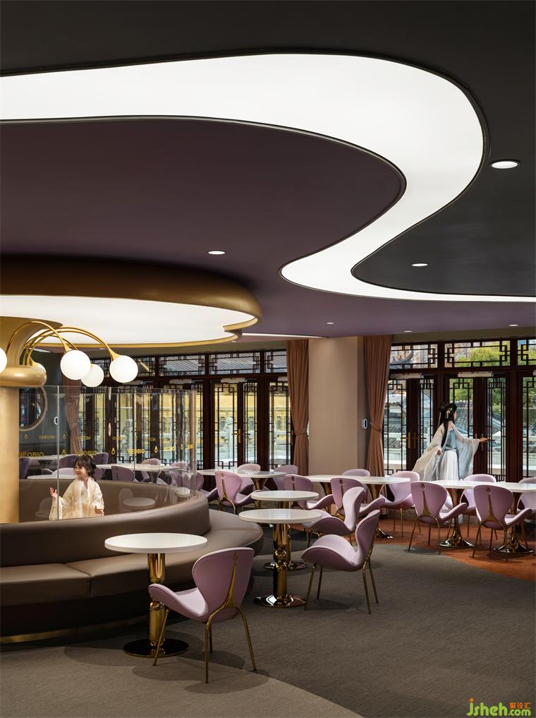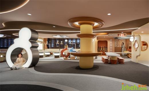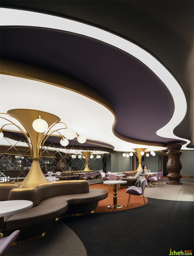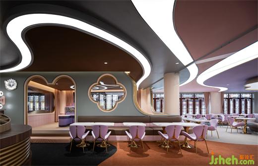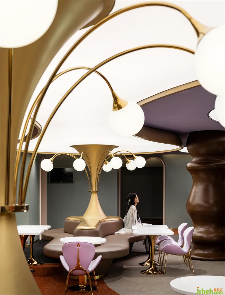 餐廳區(qū)延續(xù)生動氣象的飄逸筆觸,游離發(fā)散而又回旋統(tǒng)一,兒童樂園設(shè)計無時間印記的可塑材料結(jié)合流線型的座椅單元,枝型燈具以豫園燈會作為文化意義的投射。時間、色彩、線條以復合的存在形式,不斷遞進異時空故事的交錯感。