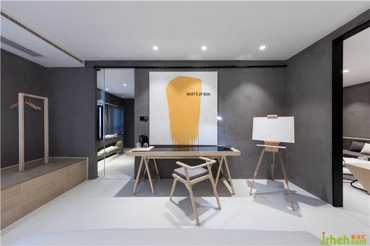 酒店坐落在杭州濱江區(qū),星光大道商圈內(nèi)。入口并不起眼,需要從商場內(nèi)部進(jìn)入,7樓。來到門前,小巧簡白的酒店門口簡單寫著“麥尖”兩字。設(shè)計師設(shè)計了一個小回廳在門口,人們需要看到酒店名字之后穿繞過回廳才能進(jìn)入大堂,回廳的端景處,沒有傳統(tǒng)的條案配藝術(shù)品等裝飾,而是一面酒店客房所有所需的用品立面展示,全部漆成白色,用玻璃封裝而成一個櫥窗,玻璃外面用橙黃色大大的寫著“hallo”,像是客房里的所有物件齊聚一堂來歡迎即將入住的客人。