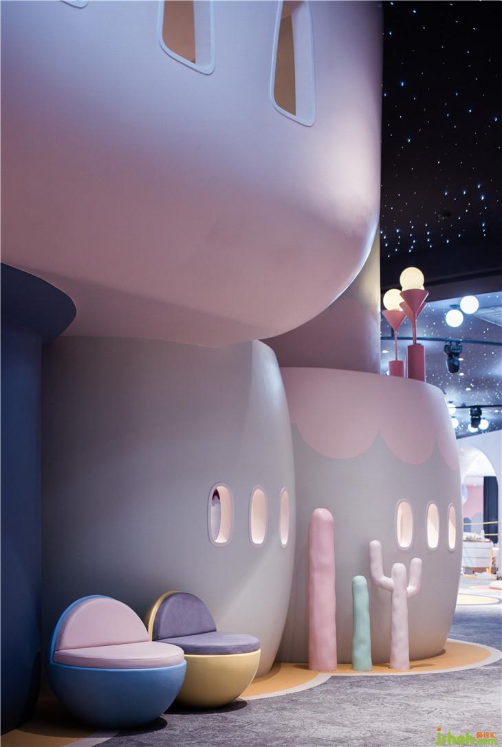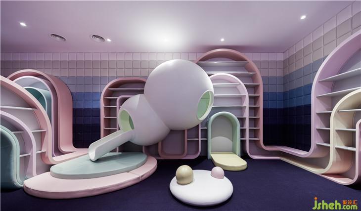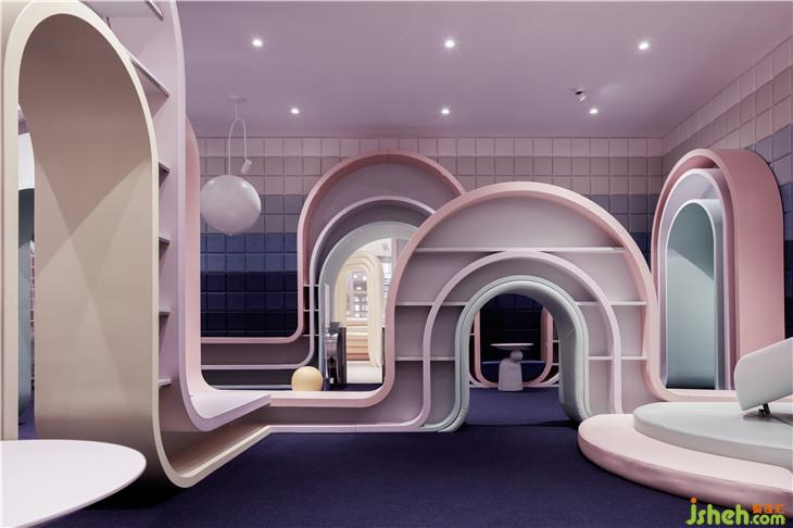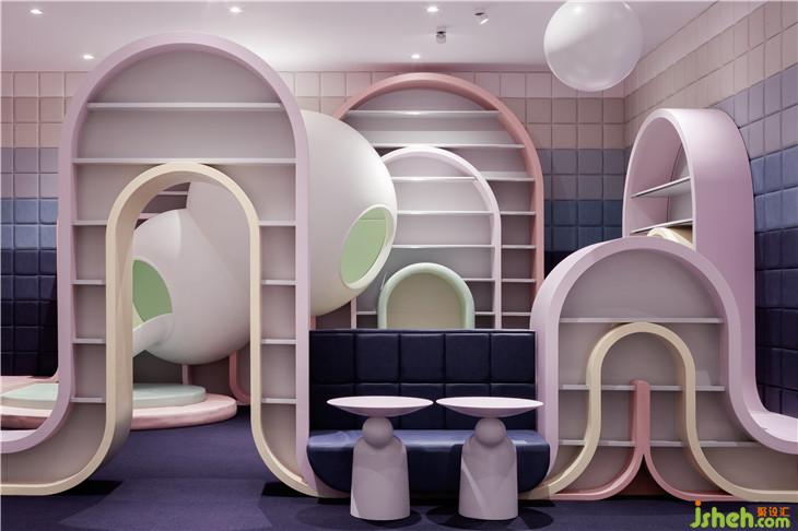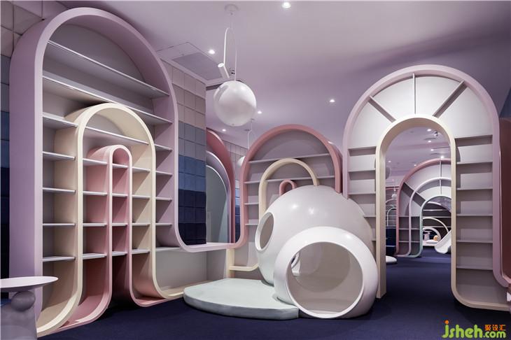 第二區(qū)域:圖書區(qū)--借用彩虹與云朵的關系表達雨過天晴后的絢麗景象,并用抽象后的構(gòu)圖完成書架功能以及孩子樂于實踐的爬高與鉆洞的娛樂功能。