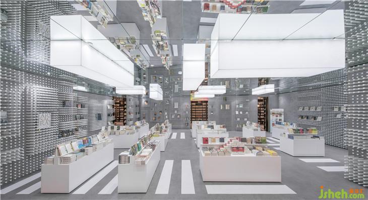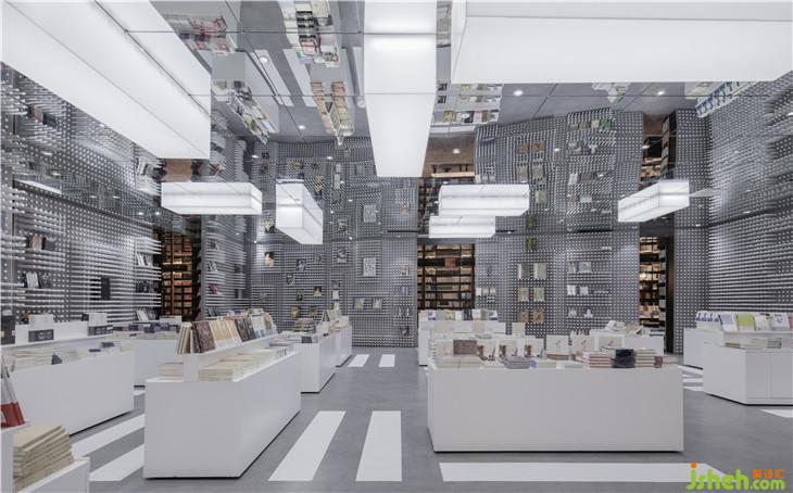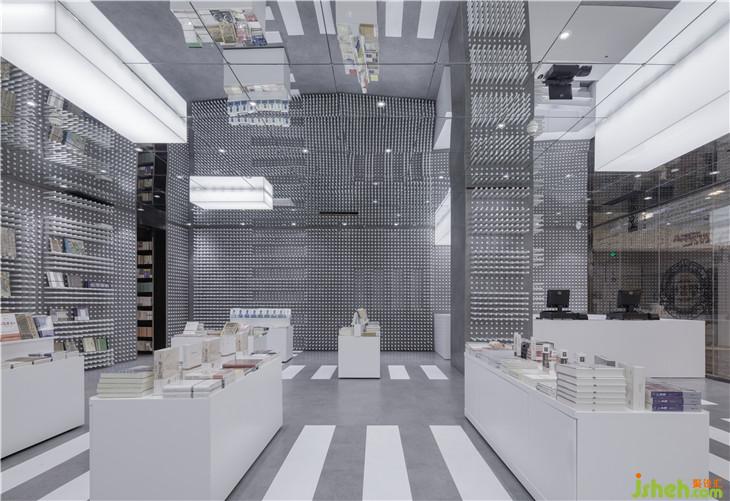 乘坐電梯來(lái)到四樓并向深處看去,可能就會(huì)看到鐘書閣的字幕玻璃幕墻,隱約可見(jiàn)其中干凈整潔灰白色調(diào)和諧暈染,安靜的光暈透過(guò)字幕幕墻的空隙傳遞出來(lái)。走近,走進(jìn)。你便知道這次鐘書閣要講的與書的故事與斑馬線有關(guān)。這正是這家鐘書閣要表達(dá)的情懷,也是上海這座繁忙的城市的縮影。素色的混凝土映射著著城市的馬路顏色,白色擺書臺(tái)橫豎有致靜立路面,鏈接每個(gè)書臺(tái)的地面畫著一條條白色的人行橫道線條,明確指引著書臺(tái)與書臺(tái)間的路徑。滿墻陣列的白色的圓管每一根都可以自由伸縮進(jìn)墻體,通過(guò)這樣的機(jī)動(dòng)性可以塑造不同樣式的陣列圖形,這種變換的形式亦是擺放書的架臺(tái)亦同時(shí)更映射了快速變換的社會(huì)現(xiàn)狀。在這里讀者儼然進(jìn)入到了一個(gè)城市空間,但是這里沒(méi)有車水馬龍,只有安安靜靜的路與斑馬線,還有在書臺(tái)上落成山的書。因?yàn)榘唏R線好比那一本本伴隨我們成長(zhǎng)的書籍。在對(duì)的時(shí)間,遇到對(duì)的指引。由此來(lái)表達(dá)書與讀者的精神關(guān)聯(lián)。室內(nèi)設(shè)計(jì)師