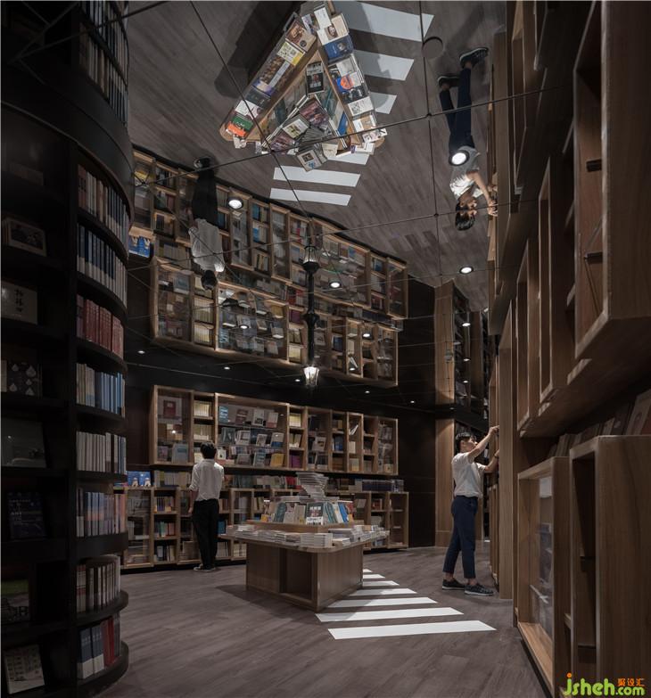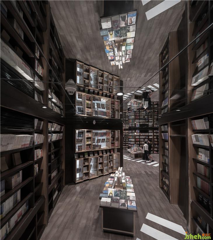 穿越這安靜的圖書公園便來到了書籍的天空之城,一條蜿蜒的路徑貫穿4幢由書架構(gòu)筑成如建筑般的書架,讓讀者體驗穿越在真正的書的城池,在路徑上看在這里每一間房子外的墻都是書架構(gòu)成,而且留有大面積的可透視窗口,可以看見“房子”內(nèi)的情景,但從房子內(nèi)部看則是一個個文化藝術(shù)主題和相應(yīng)的書籍館。4間建筑內(nèi)面積有大有小,小型的猶如一個安靜的書房,大的可以容納小型的讀書會。這里用書記構(gòu)建城市的模樣,與外界喧囂的街區(qū)不同,這里只有安靜與作者之間的隔空交流與感悟的精神世界。書架之間的路徑寬窄漸變,曲徑優(yōu)折間可見地面標示的斑馬路線,這里,恍惚間像是走在上海的百年街道感受浪漫與上海的情懷。室內(nèi)設(shè)計師