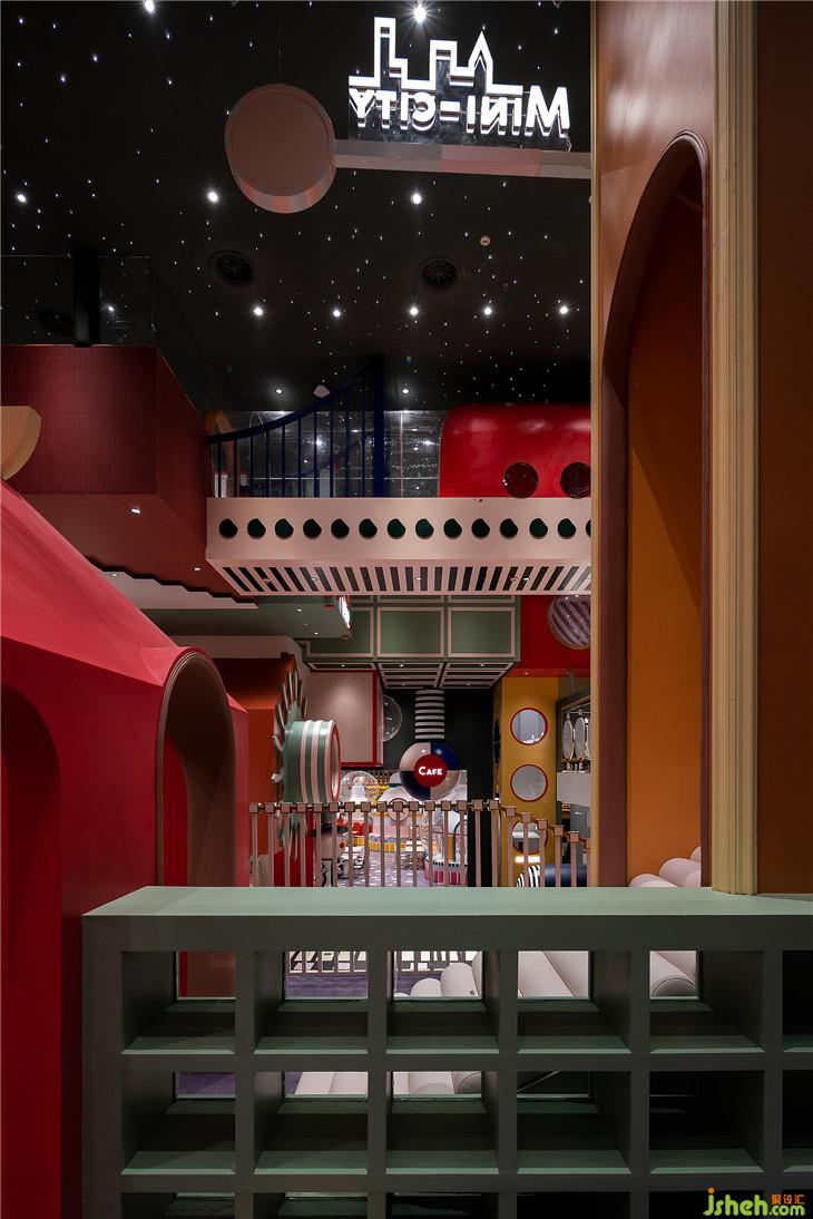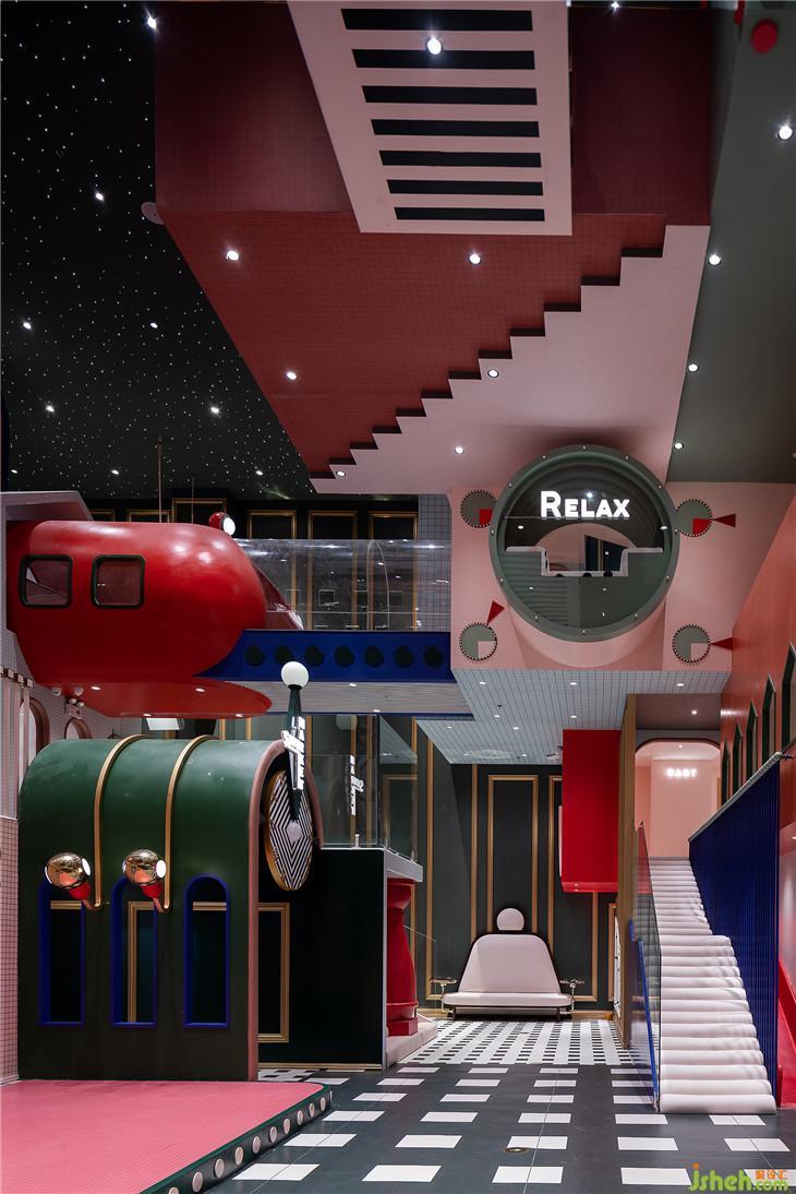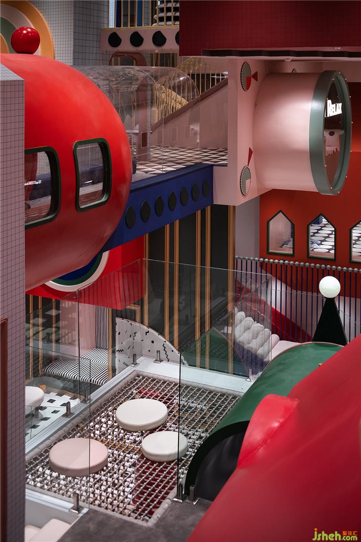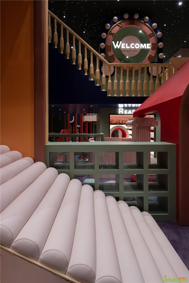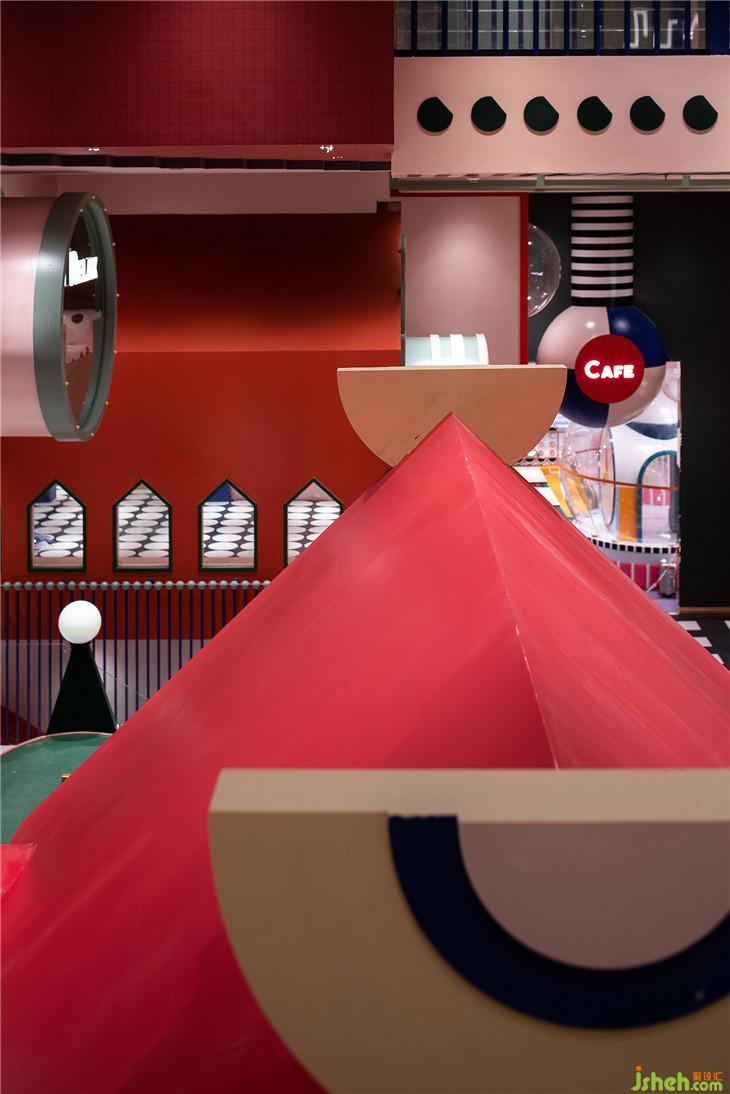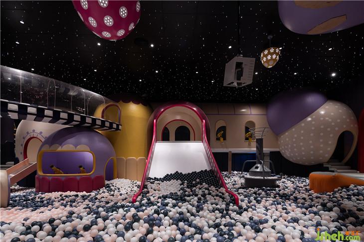 球池區(qū)位于平面空間上的西南角,像是MELAND城市邊緣一塊未經(jīng)開發(fā)的密林。由青蛙和蝸牛藝化而成的大型裝置,包裹住娛樂設(shè)施的同時(shí)也串聯(lián)起了爬道和滑梯。奇幻紫調(diào)與夸張波點(diǎn)的活潑搭配,刺激著小朋友解放愛玩鬧的天性。與傳統(tǒng)的室內(nèi)攀爬不同,在MELAND的攀爬區(qū),白色的背景墻配以紅色的支點(diǎn),與延伸到地面的紅色波點(diǎn),共同堆砌出了這個(gè)空間時(shí)尚而怪誕的藝術(shù)質(zhì)感。