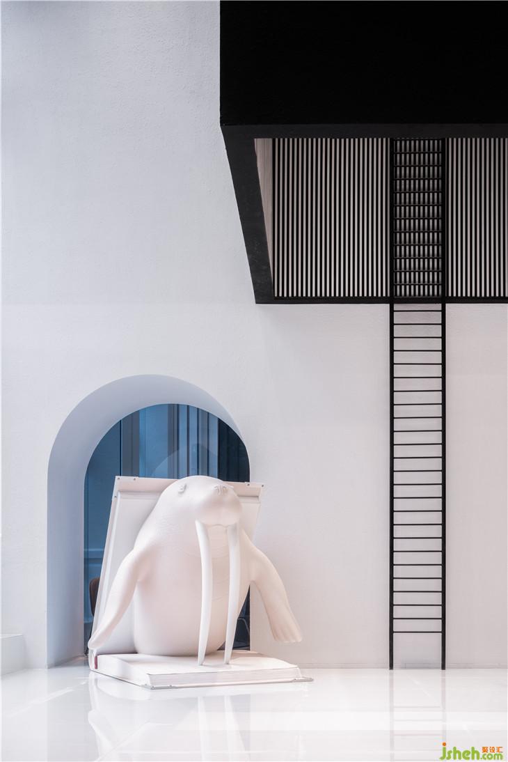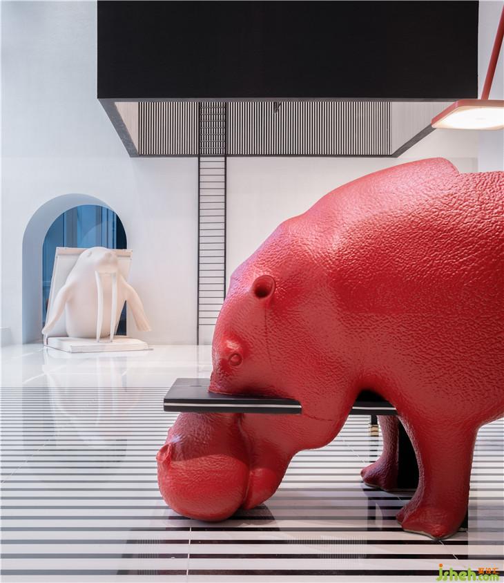 在設(shè)計上我們放棄對風(fēng)格的描述,對每組的藝術(shù)裝置我們也放棄描述。而是先通過對結(jié)構(gòu)、流線、色彩與圖形的整合以來完成空間的優(yōu)雅氣質(zhì)感,用抽象自然界的極簡圖案來完成襯托背景視覺,肅靜極簡的空間主體背景更引發(fā)消費者在這里有參觀藝術(shù)館的同理感觸。后把對動物刻畫的環(huán)節(jié)精雕細(xì)酌,并在細(xì)節(jié)上注重靜物陳設(shè)的構(gòu)圖美學(xué);主旨意在使具象與抽象糅合并體。并拿捏空間疏密比例,使得空間體現(xiàn)參與互動性,通過興趣的引導(dǎo)從而引發(fā)視覺背后的思考。在整體設(shè)計的環(huán)節(jié)中,我們也結(jié)合動物主題研發(fā)多種原創(chuàng)藝術(shù)家具、畫作及墻面墻面藝術(shù)裝置環(huán)節(jié),使觀賞與功能性并存。所有的手法最終指向一種善意的示好,使一段美好的停駐時光變成更富有價值的記憶。