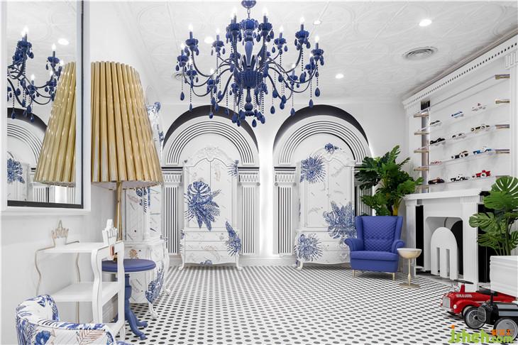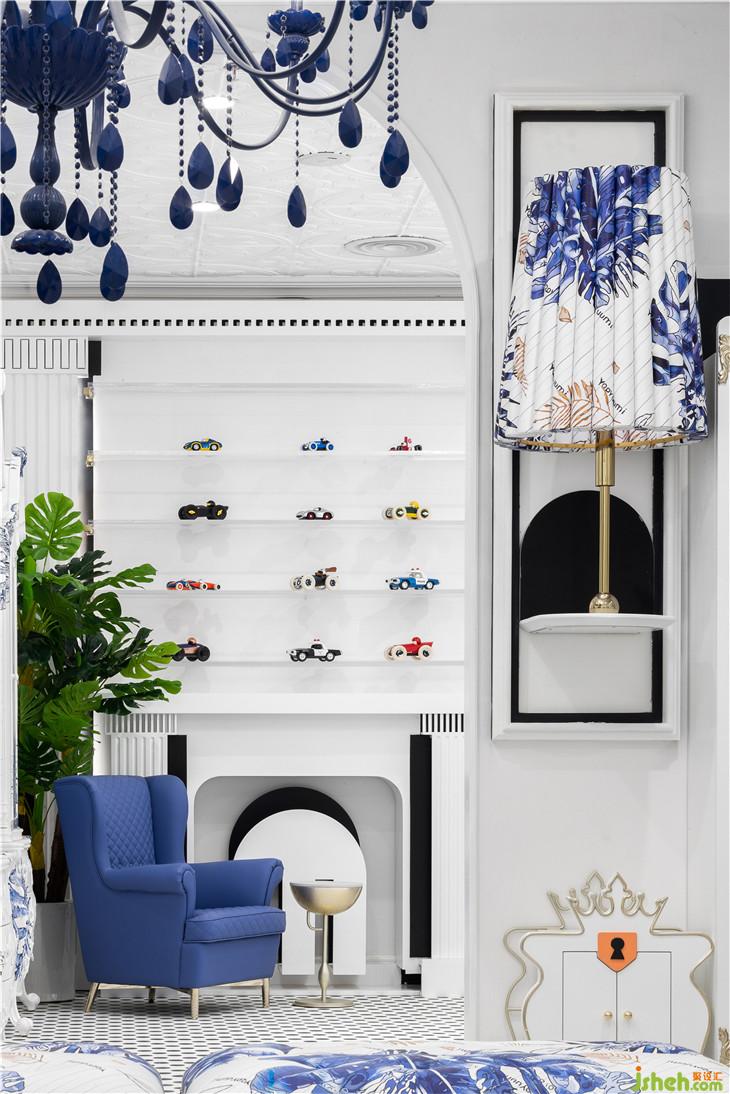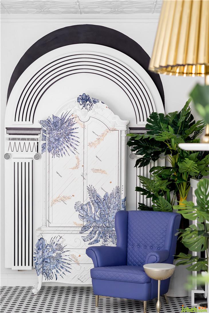 純凈高雅的白色勾勒出了空間明亮輕快的主色基調(diào),設(shè)計師將精美的花卉圖樣巧妙地表現(xiàn)在了家具軟包與柜體等不同介質(zhì)上,雖工藝復(fù)雜,卻使得統(tǒng)一的花紋像潑墨般恣意游走在純白畫布上,使空間不僅有了靈動的色彩,又引申出了一條明確的追隨主線?;y用青花藍(lán)重塑了綠植圖案,烘托出了空間生機(jī)盎然的溫馨氣質(zhì)。而其余大色塊的運(yùn)用,則填充了歌劇質(zhì)感的濃郁撞色背景,結(jié)合拱形帷幔打造的舞臺場景感,隱喻了項目業(yè)主的職業(yè)特性。歐式門拱與中式剪紙的形式呼應(yīng),歌劇質(zhì)感撞色與雅致青花藍(lán)的色彩襯映,刻意濃郁的色彩比臨與隨性撒墨的手法對沖,中西方美學(xué)韻味在此相遇,迸發(fā)出縈滿審美意趣的奇妙對話。