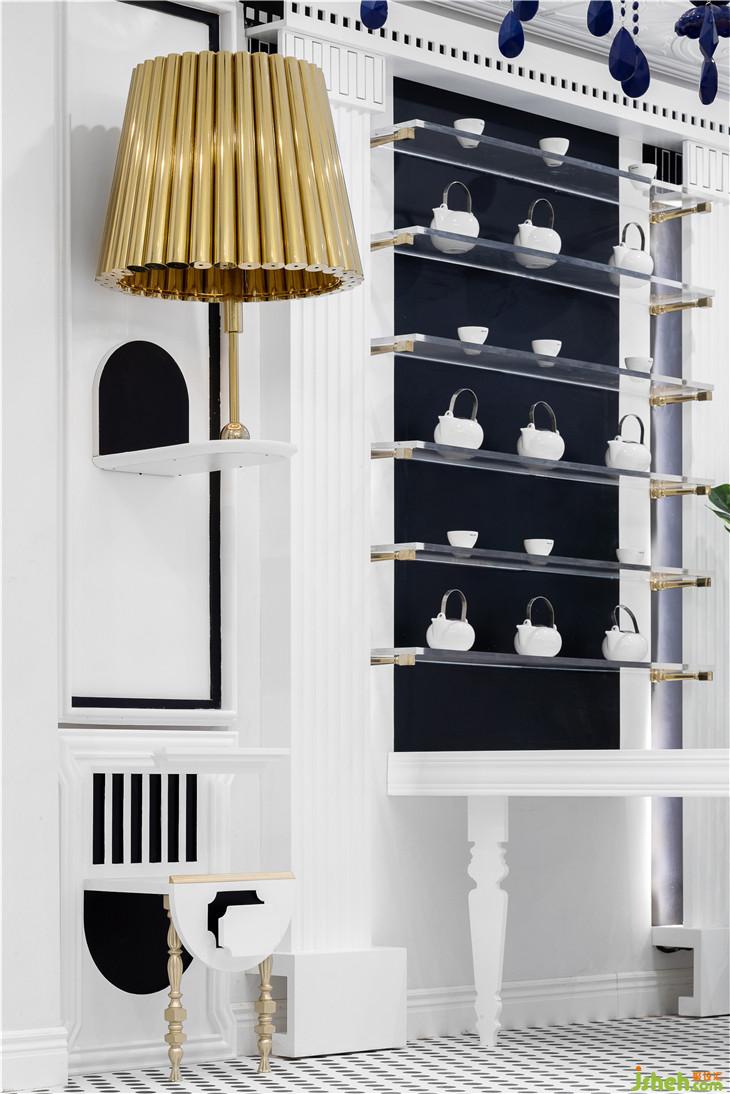 前廳的裝飾樣式延伸至了換鞋區(qū),猶如走近城堡的回廳,精美的大衣柜與展示柜用作鞋柜,既保障了隱私性,又充分照顧到消費者舉止得體的心理需求。陳設(shè)方案的創(chuàng)新性在弱化功能目的性的同時,將客戶的商業(yè)訴求捏合進(jìn)了整體性的空間美感。設(shè)計師運(yùn)用西方貴族生活場景下的空間疊進(jìn)儀式感,襯托出對空間客體展示出的優(yōu)雅禮儀服務(wù)。