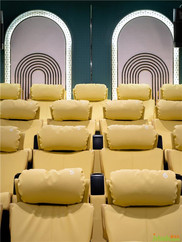 輕奢優(yōu)雅的三號(hào)影廳采用了古典建筑元素拱門,帶來規(guī)整的秩序感,黑白條地毯和座椅點(diǎn)綴寧?kù)o的深綠空間,流動(dòng)的視覺感受低調(diào)地烘托著影像故事。