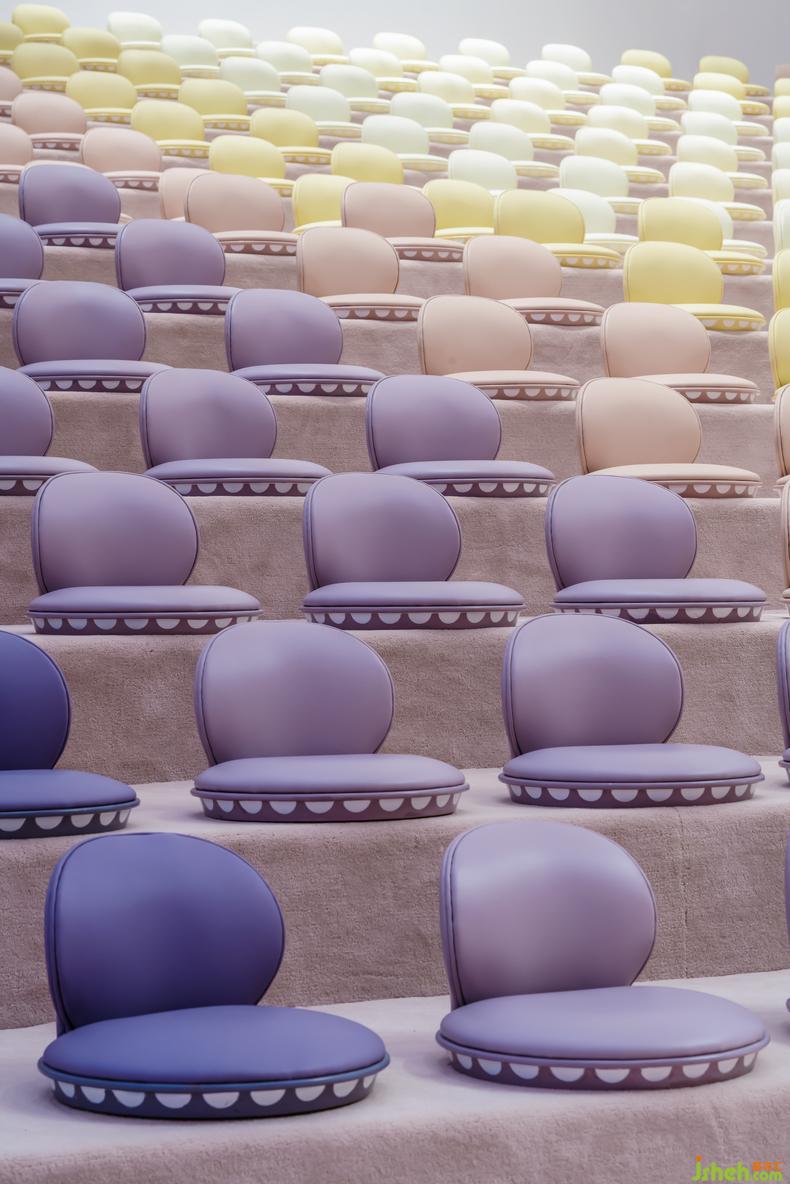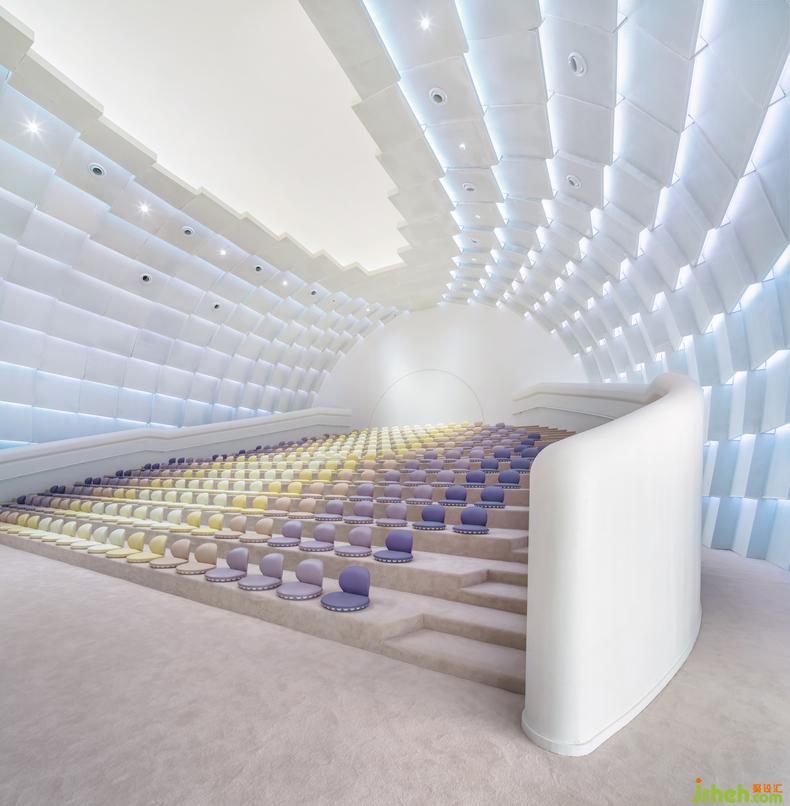 童話的質(zhì)感與色彩在禮堂內(nèi)愈加濃郁,球形的吊頂與白色的背景烘托了禮堂莊重圣潔的質(zhì)感,點(diǎn)亮場(chǎng)內(nèi)的背景燈,漸變色的座椅與燈光暈染出動(dòng)人的霞光,讓整個(gè)空間顯得靈動(dòng)柔美。孩子們仿佛在綻放的花蕊中,像一只只靈巧漂亮的小蝴蝶。