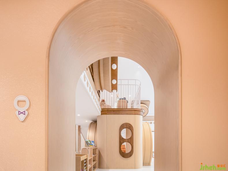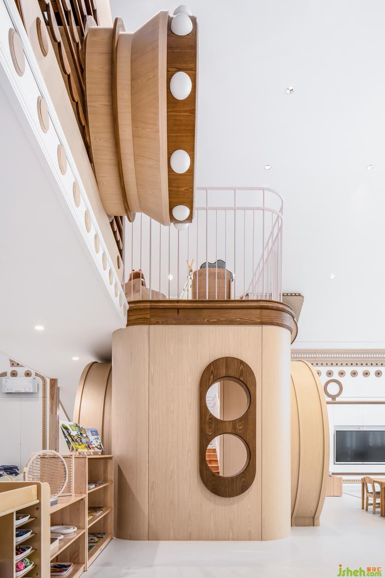 尖頂?shù)慕ㄖ庑螏砹颂厣拈w樓生活教室,幼兒園設(shè)計(jì)懷著“留下孩子們生命中的每一刻”的美好祝愿,引入了照相機(jī)這一設(shè)計(jì)元素。借用閣樓的挑高,設(shè)計(jì)師設(shè)計(jì)了可供上下攀爬的游樂區(qū),滿足小朋友玩鬧的天性,而相機(jī)的鏡頭成了孩子們的通道與爬道。墻面童趣化的裝飾呼應(yīng)了家具的淺柔的木色,也勾勒出了精致的貴族感,讓整體空間簡(jiǎn)約而溫馨。