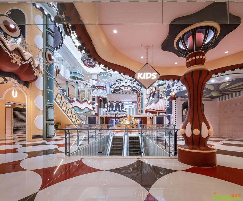 主題公區(qū)設計師從空間結構切入,以高維度的建筑策略性思考,制造了一場關乎商場公區(qū)美學體系的巨大反轉,同時依舊妥善滿足功能性與商業(yè)角度的現(xiàn)實考量。故事性空間語言與兒童成長教育在此共融共筑,成就了主題性商場風格迥異的商業(yè)典案。