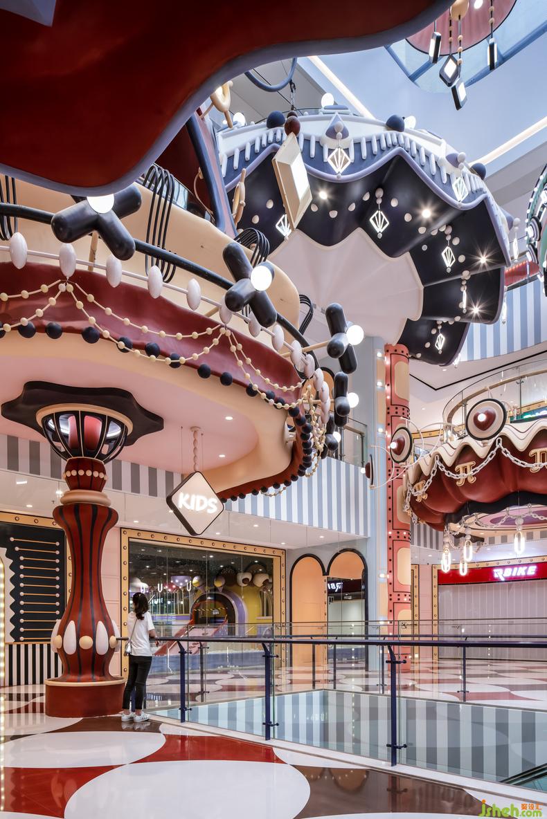 有別于多數(shù)商區(qū)規(guī)整單調(diào)的布局慣性,主題公區(qū)設(shè)計師一反常規(guī)的店鋪邊界,引入了前后突進(jìn)式的布局來塑造兒童空間趣味性。不僅在平層的橫向維度上優(yōu)化了店鋪的面積使用,使消費(fèi)者的購物動線變得富有探索樂趣,更從縱向維度出發(fā),豐富商場樓層之間上下關(guān)系的交互性,使得整個內(nèi)庭的空曠感大大減少,聚攏了消費(fèi)人氣。