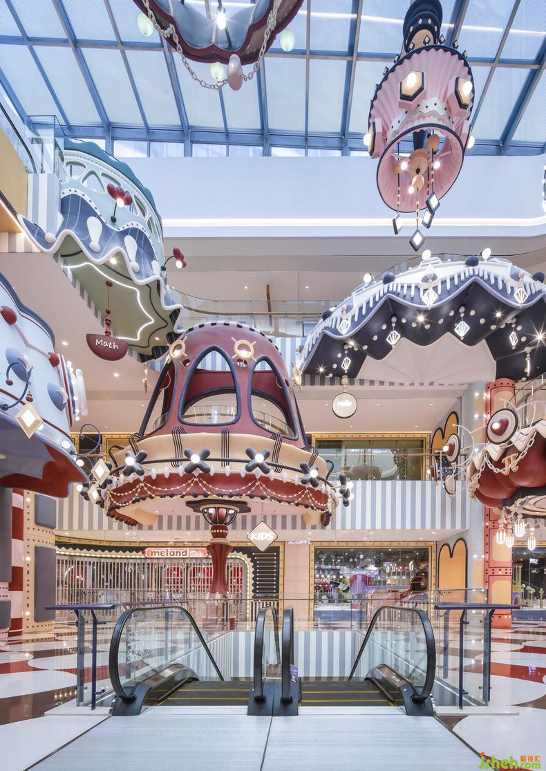 設(shè)計師突破傳統(tǒng)裝飾美學(xué),賦予書本、臺燈、鳳尾夾、主題公區(qū)設(shè)計尺子等文具恢弘的建筑尺度,營造兒童區(qū)獨特的沉浸式體驗效果。巨型構(gòu)造與日常用品的奇異尺度反差,不僅更好地統(tǒng)籌了公區(qū)內(nèi)攔河裝飾、燈具、店鋪立面、導(dǎo)向標(biāo)識等,且場景的交錯讓童話氛圍能夠迅速傳達(dá)到人群,準(zhǔn)確捕捉主力消費(fèi)者的注意力。
