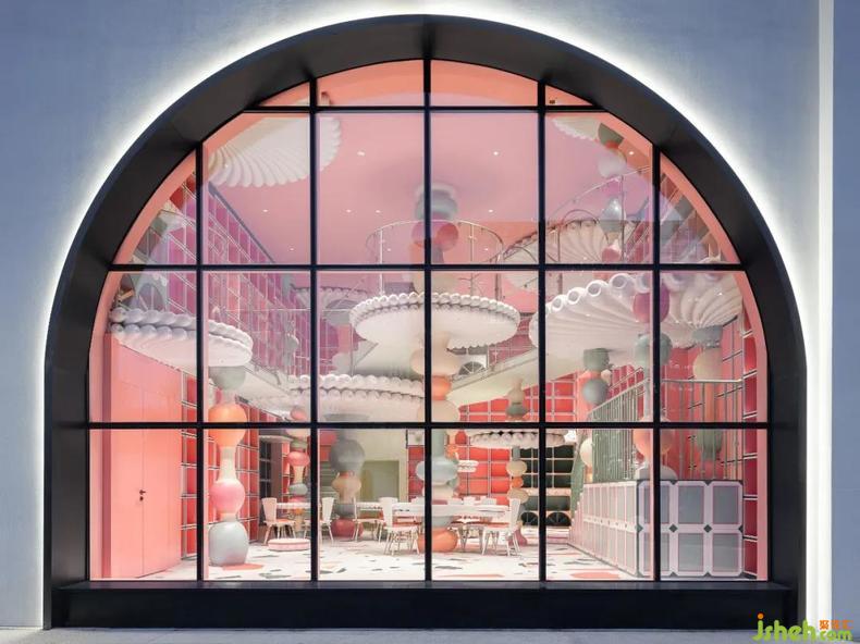 于方形的建筑盒體底部洞開(kāi)一組大小各異的拱形門(mén)窗,曲線(xiàn)增添了些許柔和觀感。門(mén)窗中不同區(qū)域的風(fēng)光如畫(huà)卷展開(kāi),吸引客群的目光,延伸空間內(nèi)部的印象與意蘊(yùn)。入口恢宏的尺度賦予了人震撼的身心體驗(yàn),純白極簡(jiǎn)的建筑外殼中包裹的極致夢(mèng)幻內(nèi)核眼入眼簾。