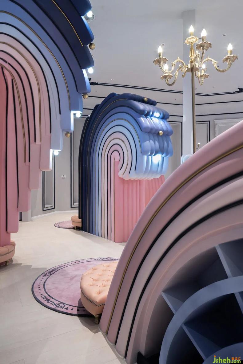 當(dāng)客人步入接待換鞋區(qū),聆聽(tīng)眼前海洋的潮汐奏鳴。設(shè)計(jì)師將功能和美學(xué)統(tǒng)籌為整體,藝術(shù)性地提煉浪花元素演化為鞋柜與服務(wù)臺(tái)。樂(lè)園設(shè)計(jì)形如彩虹的甜美浪花在室內(nèi)翻騰,堆疊出瑰麗的海面,以多功能L形前臺(tái)為中心的單向動(dòng)線(xiàn)串聯(lián)了接待區(qū)和零售區(qū),并激活服務(wù)臺(tái)對(duì)雙區(qū)的服務(wù)屬性。