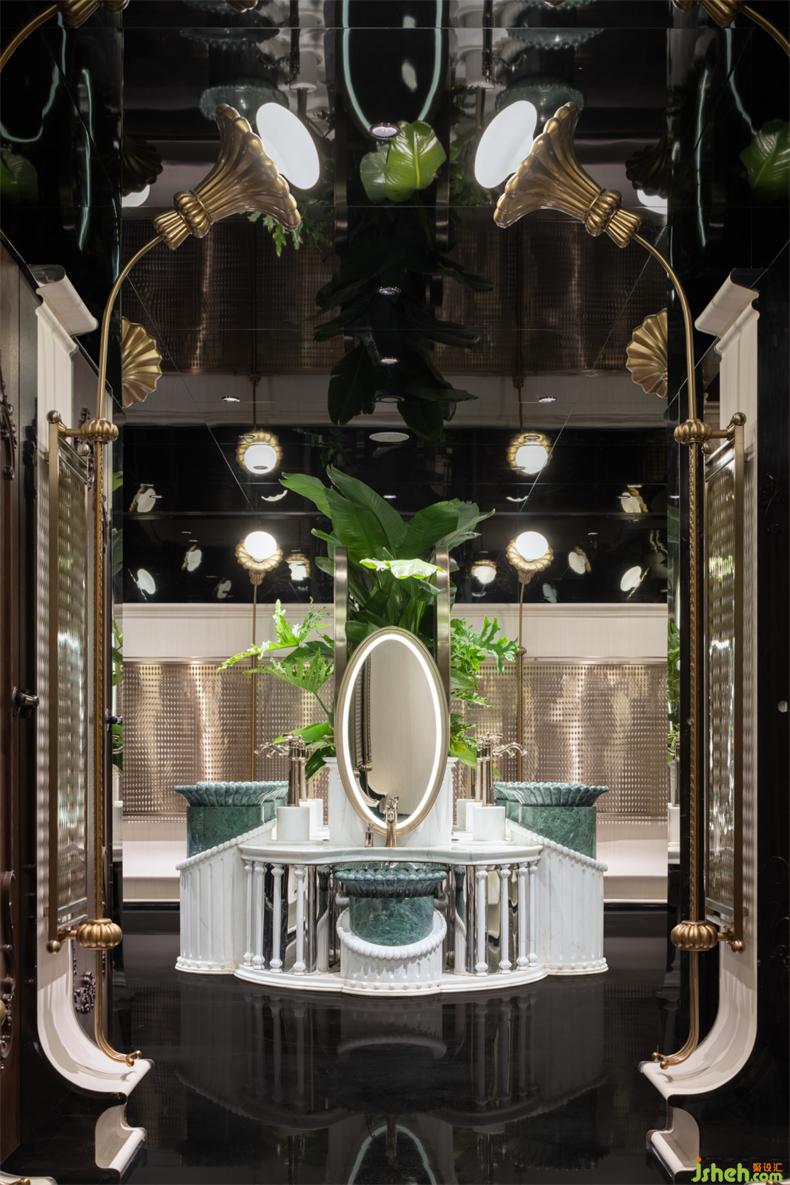 盥洗臺(tái)靈感來(lái)源于花園中的噴泉,巧妙利用高差將功能性妥當(dāng)融入,衛(wèi)生間設(shè)計(jì)綠植與綠色大理石洗手臺(tái)盆既呼應(yīng)了空間故事線,也使其成為室內(nèi)唯一色彩鮮明的視覺(jué)焦點(diǎn)。