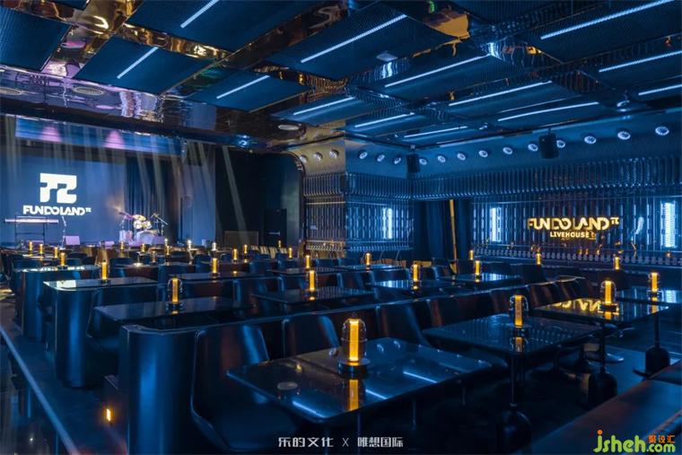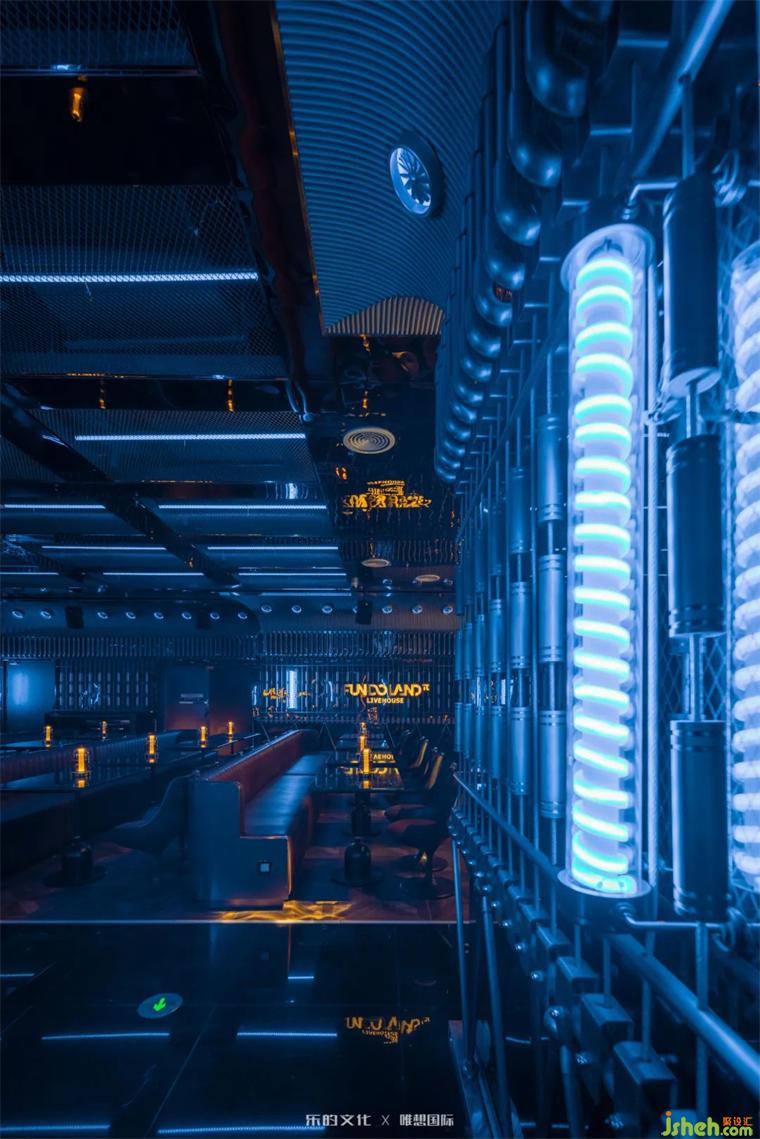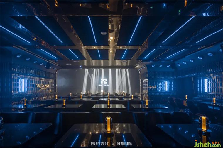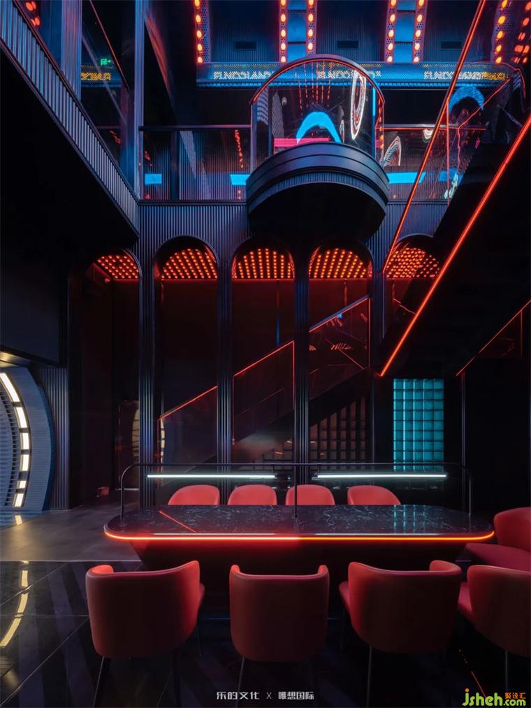 新式KTV入口位于隧道餐酒吧的盡處,裝修設(shè)計師在平面規(guī)劃階段刻意犧牲了二層的部分面積,以打造雙層挑高門廳的震撼視覺效果。雙座樓梯交錯出X字母的造型,設(shè)計師運用符號美學(xué)將空間的魔幻調(diào)性把握得淋漓盡致。裝修設(shè)計暗黑金屬烘托出的神秘氛圍,在紅色線性燈帶和幾何光斑的點綴下,呈現(xiàn)出近乎迷幻的未來美學(xué)。