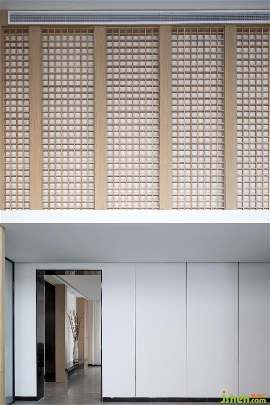在墻這類實(shí)隔上覆以小格子線條勾勒的木格柵,淡化了邊界存在感,韜藏本真之美的原木、玻璃與小面積石材,藉由種種素樸無鑾素材,讓場(chǎng)域遞送著一派和潤(rùn)素拙的味道。