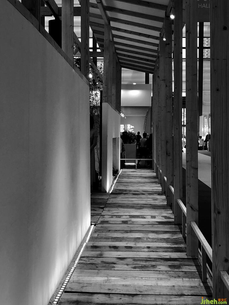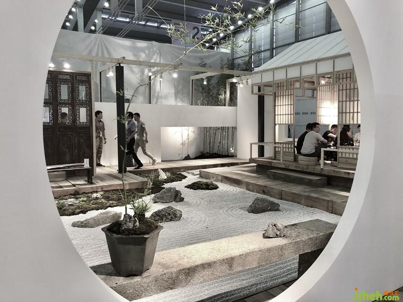 門庭雅潔,設計師在展位主次通道上皆設門庭入口,以修竹和逸石修飾。主入口處條石鋪陳連結(jié)老木板抬高的過道,過道上的漏窗和轉(zhuǎn)身處的月洞門皆是園林框景,給人以東方清雅澹靜的的精神意趣。