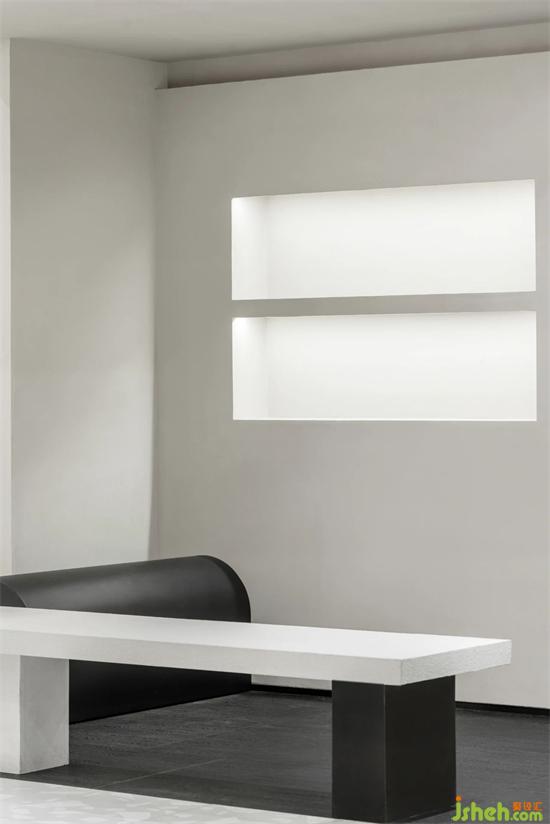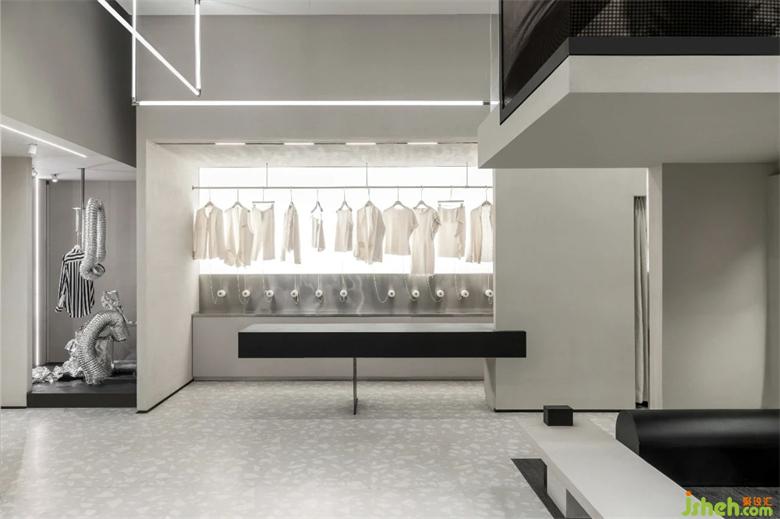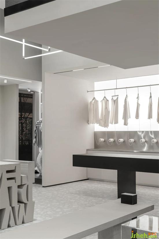 LEDIM WANG除了提供成衣以外,全系列產(chǎn)品也提供尺寸、顏色、面料的個性化定制服務(wù)。旗艦店設(shè)計因此設(shè)計團隊將前臺接待區(qū)與定制服務(wù)區(qū),兩個功能區(qū)整合,用框景的手法,結(jié)合背面的定制成衣展示空間,打造出有層次感的復(fù)合功能空間。