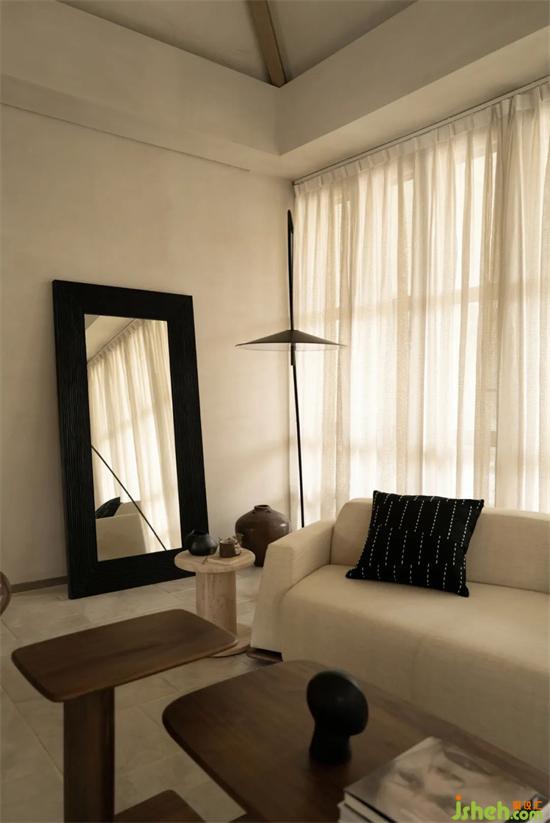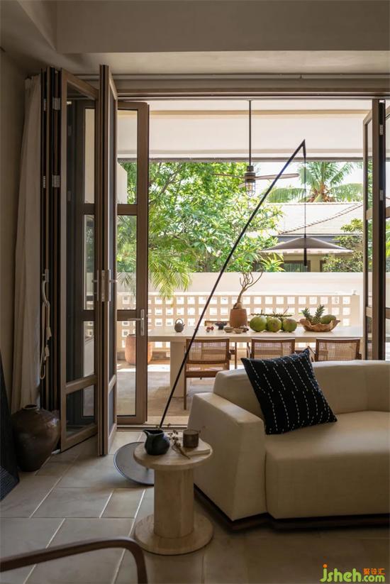 正對(duì)客廳用推拉式全開玻璃門讓客廳與院落隨時(shí)聯(lián)通,順著海風(fēng)將椰林的香氣帶入室內(nèi)。房間內(nèi)保留了大面積的玻璃窗,別墅設(shè)計(jì)將外景納入室內(nèi),院墻的方格石籬笆讓陽光斑駁地照進(jìn)來,顯得格外清透。