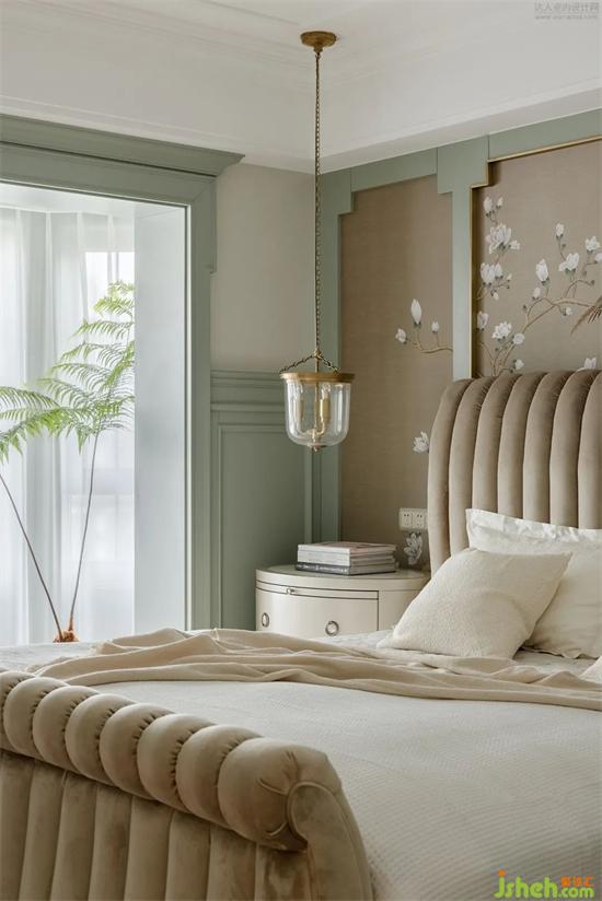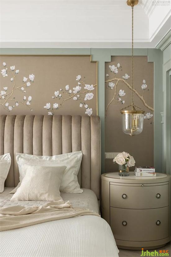 走進(jìn)主臥空間,極其擁有線條感的墻板,搭配著擁有柔軟質(zhì)地的織物,把內(nèi)屋的門框設(shè)計(jì)為氣窗,聯(lián)通主臥、衣帽間及衛(wèi)生間兩個(gè)區(qū)域,氣窗可折疊開合,也可調(diào)整窗葉角度,讓整個(gè)空間既能隔斷又仍有聯(lián)系。家裝設(shè)計(jì)東方花鳥墻畫猶如海闊天地的意境承載空間里的一切,感覺像是一幅具有東方寫意的畫作,營造出擁有靈動(dòng)的高級氛圍。