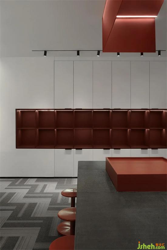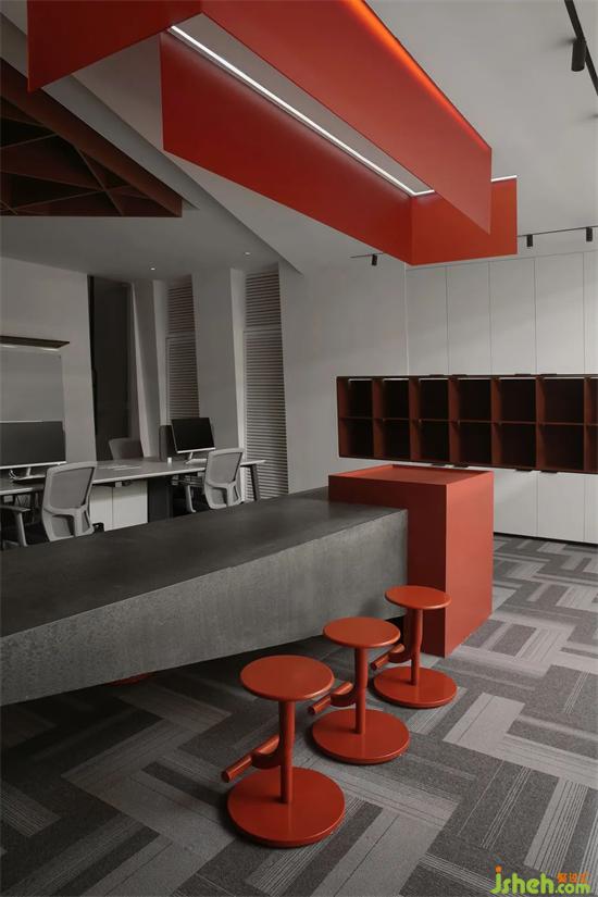 辦公區(qū)域,由自由切面包裹所形成的內(nèi)部空間,空間自由通透同時又機具張力,辦公設(shè)計讓原本呆板的轉(zhuǎn)角空間,得以很好的視覺延展。簡潔開放的辦公區(qū)域,頂上多邊形構(gòu)架,以及墻面收納柜體,整體而統(tǒng)一很好的呼應(yīng)空間主體的設(shè)計語言。